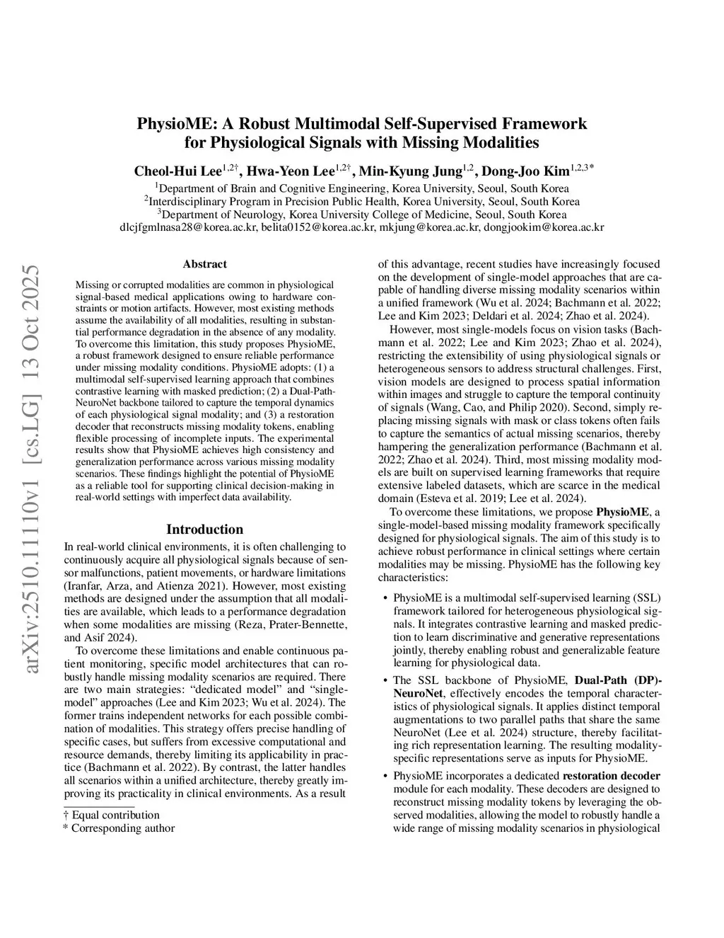 Missing or corrupted modalities are common in physiological signal-based medical applications owing to hardware constraints or motion artifacts. However, most existing methods assume the availability of all modalities, resulting in substantial performance degradation in the absence of any modality. To overcome this limitation, this study proposes PhysioME, a robust framework designed to ensure reliable performance under missing modality conditions. PhysioME adopts: (1) a multimodal self-supervised learning approach that combines contrastive learning with masked prediction; (2) a Dual-PathNeuroNet backbone tailored to capture the temporal dynamics of each physiological signal modality; and (3) a restoration decoder that reconstructs missing modality tokens, enabling flexible processing of incomplete inputs. The experimental results show that PhysioME achieves high consistency and generalization performance across various missing modality scenarios. These findings highlight the potential of PhysioME as a reliable tool for supporting clinical decision-making in real-world settings with imperfect data availability.