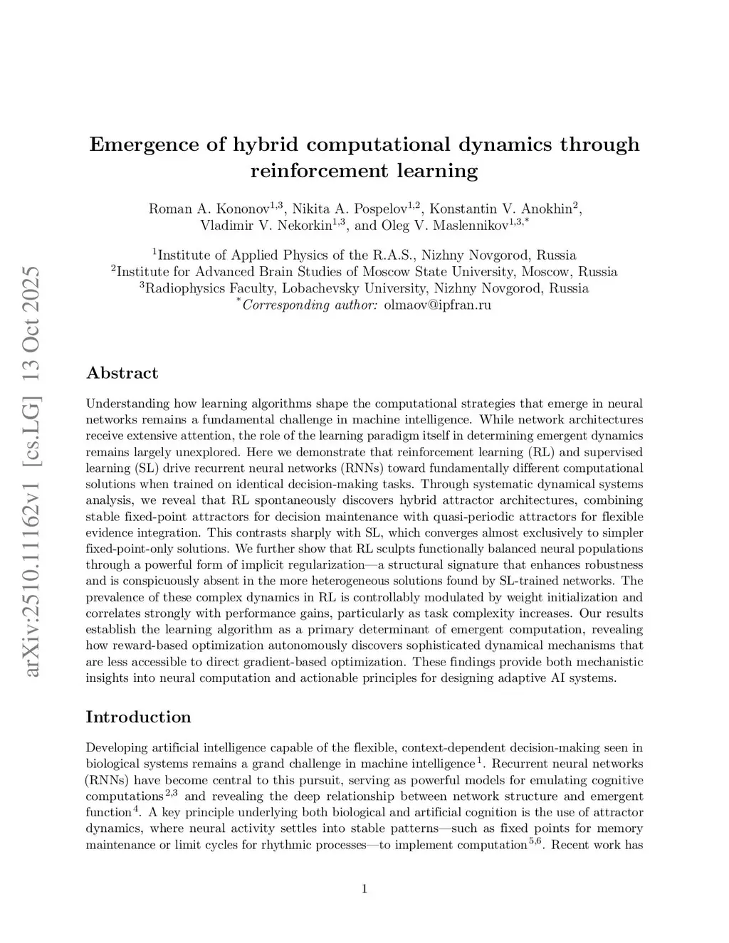 Understanding how learning algorithms shape the computational strategies that emerge in neural networks remains a fundamental challenge in machine intelligence. While network architectures receive extensive attention, the role of the learning paradigm itself in determining emergent dynamics remains largely unexplored. Here we demonstrate that reinforcement learning (RL) and supervised learning (SL) drive recurrent neural networks (RNNs) toward fundamentally different computational solutions when trained on identical decision-making tasks. Through systematic dynamical systems analysis, we reveal that RL spontaneously discovers hybrid attractor architectures, combining stable fixed-point attractors for decision maintenance with quasi-periodic attractors for flexible evidence integration. This contrasts sharply with SL, which converges almost exclusively to simpler fixed-point-only solutions. We further show that RL sculpts functionally balanced neural populations through a powerful form of implicit regularization -- a structural signature that enhances robustness and is conspicuously absent in the more heterogeneous solutions found by SL-trained networks. The prevalence of these complex dynamics in RL is controllably modulated by weight initialization and correlates strongly with performance gains, particularly as task complexity increases. Our results establish the learning algorithm as a primary determinant of emergent computation, revealing how reward-based optimization autonomously discovers sophisticated dynamical mechanisms that are less accessible to direct gradient-based optimization. These findings provide both mechanistic insights into neural computation and actionable principles for designing adaptive AI systems.