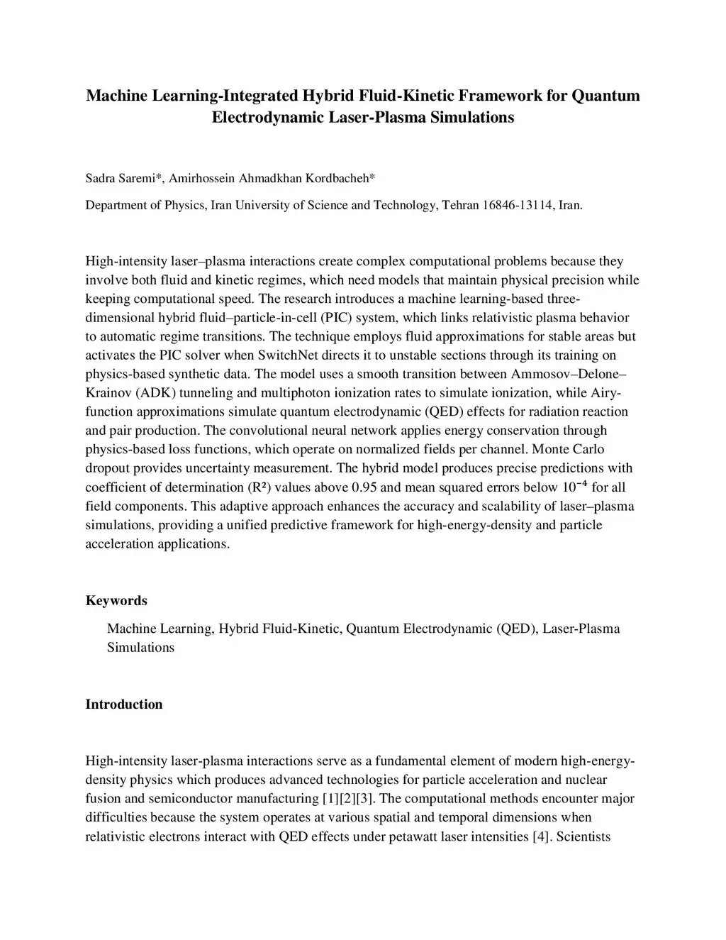 High-intensity laser plasma interactions create complex computational problems because they involve both fluid and kinetic regimes, which need models that maintain physical precision while keeping computational speed. The research introduces a machine learning-based three-dimensional hybrid fluid-particle-in-cell (PIC) system, which links relativistic plasma behavior to automatic regime transitions. The technique employs fluid approximations for stable areas but activates the PIC solver when SwitchNet directs it to unstable sections through its training on physics-based synthetic data. The model uses a smooth transition between Ammosov-Delone-Krainov (ADK) tunneling and multiphoton ionization rates to simulate ionization, while Airy-function approximations simulate quantum electrodynamic (QED) effects for radiation reaction and pair production. The convolutional neural network applies energy conservation through physics-based loss functions, which operate on normalized fields per channel. Monte Carlo dropout provides uncertainty measurement. The hybrid model produces precise predictions with coefficient of determination (R^2) values above 0.95 and mean squared errors below 10^-4 for all field components. This adaptive approach enhances the accuracy and scalability of laser-plasma simulations, providing a unified predictive framework for high-energy-density and particle acceleration applications.