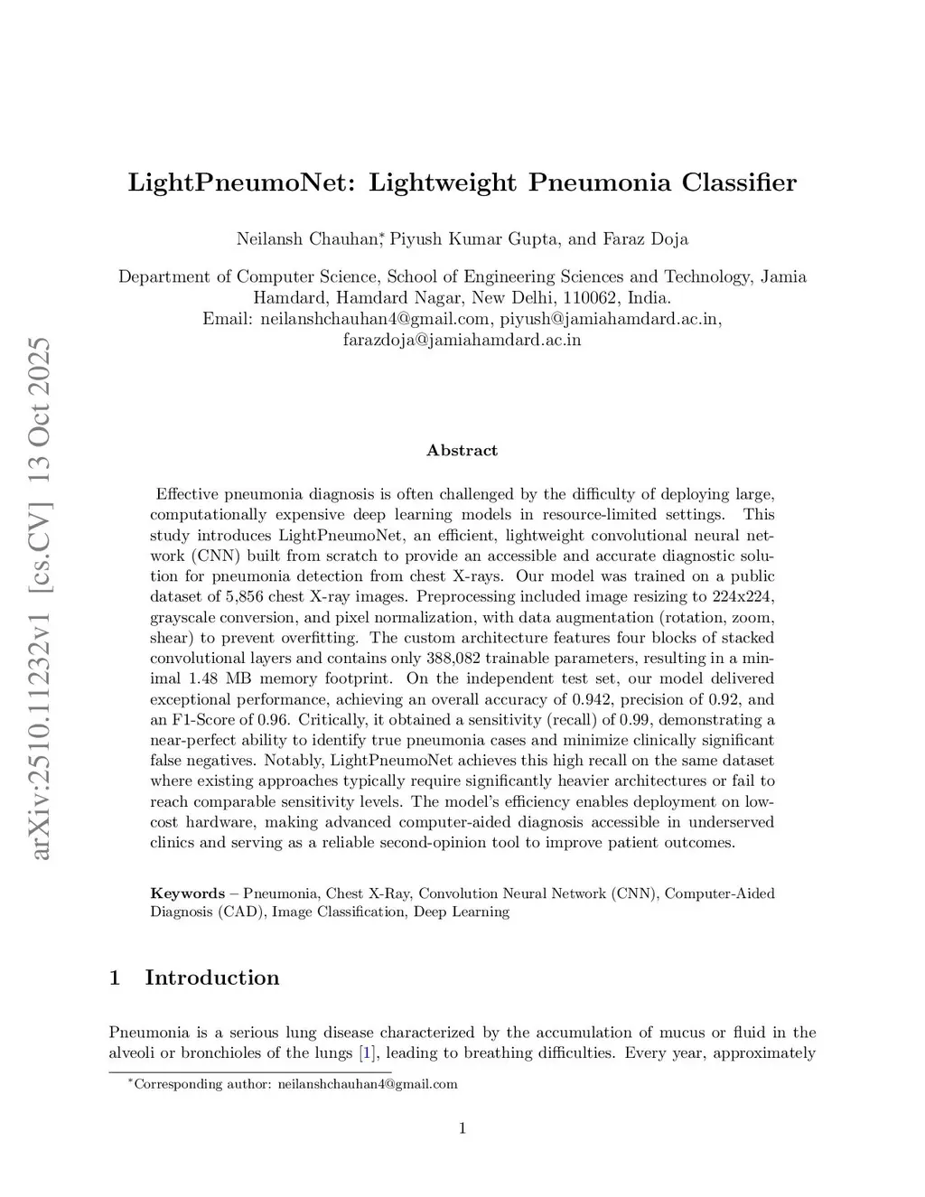 LightPneumoNet: Lightweight Pneumonia Classifier