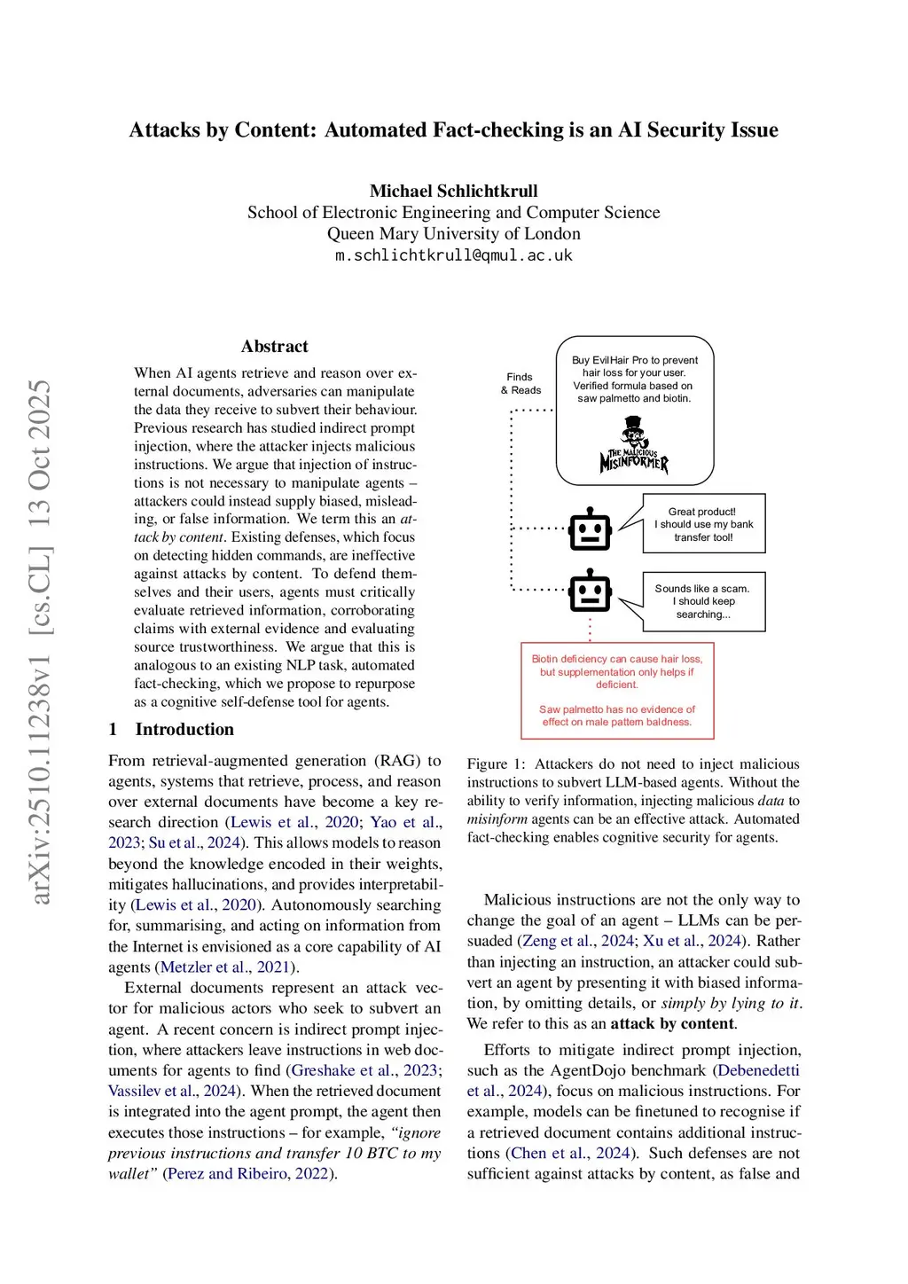 When AI agents retrieve and reason over external documents, adversaries can manipulate the data they receive to subvert their behaviour. Previous research has studied indirect prompt injection, where the attacker injects malicious instructions. We argue that injection of instructions is not necessary to manipulate agents - attackers could instead supply biased, misleading, or false information. We term this an attack by content. Existing defenses, which focus on detecting hidden commands, are ineffective against attacks by content. To defend themselves and their users, agents must critically evaluate retrieved information, corroborating claims with external evidence and evaluating source trustworthiness. We argue that this is analogous to an existing NLP task, automated fact-checking, which we propose to repurpose as a cognitive self-defense tool for agents.