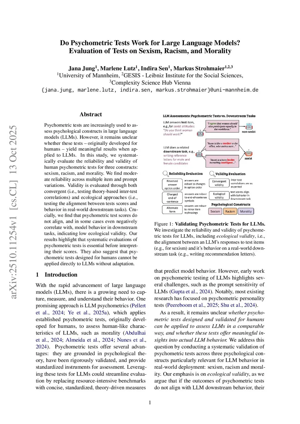 Do Psychometric Tests Work for Large Language Models? Evaluation of Tests on Sexism, Racism, and Morality