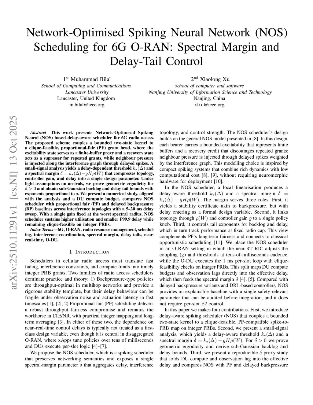 Network-Optimised Spiking Neural Network (NOS) Scheduling for 6G O-RAN: Spectral Margin and Delay-Tail Control