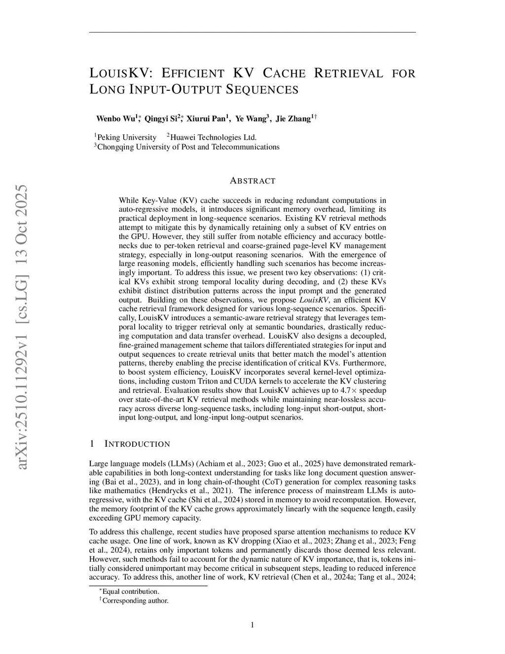 While Key-Value (KV) cache succeeds in reducing redundant computations in auto-regressive models, it introduces significant memory overhead, limiting its practical deployment in long-sequence scenarios. Existing KV retrieval methods mitigate this by dynamically retaining only a subset of KV entries on the GPU. However, they still suffer from notable efficiency and accuracy bottlenecks due to per-token retrieval and coarse-grained page-level KV management, especially in long-output reasoning scenarios. With the emergence of large reasoning models, efficiently handling such scenarios has become increasingly important. To address this issue, we present two key observations: (1) critical KVs exhibit strong temporal locality during decoding, and (2) these KVs exhibit distinct distribution patterns across the input prompt and generated output. Building on these observations, we propose LouisKV, an efficient KV cache retrieval framework designed for various long-sequence scenarios. Specifically, LouisKV introduces a semantic-aware retrieval strategy leveraging temporal locality to trigger retrieval only at semantic boundaries, drastically reducing computation and data transfer overhead. LouisKV also designs a decoupled, fine-grained management scheme that tailors differentiated strategies for input and output sequences to create retrieval units that better match the model's attention patterns, enabling precise identification of critical KVs. Furthermore, to boost efficiency, LouisKV incorporates several kernel-level optimizations, including custom Triton and CUDA kernels to accelerate the KV clustering and retrieval. Evaluations show that LouisKV achieves up to 4.7 speedup over state-of-the-art KV retrieval methods while maintaining near-lossless accuracy across diverse long-sequence tasks, including long-input short-output, short-input long-output, and long-input long-output scenarios.