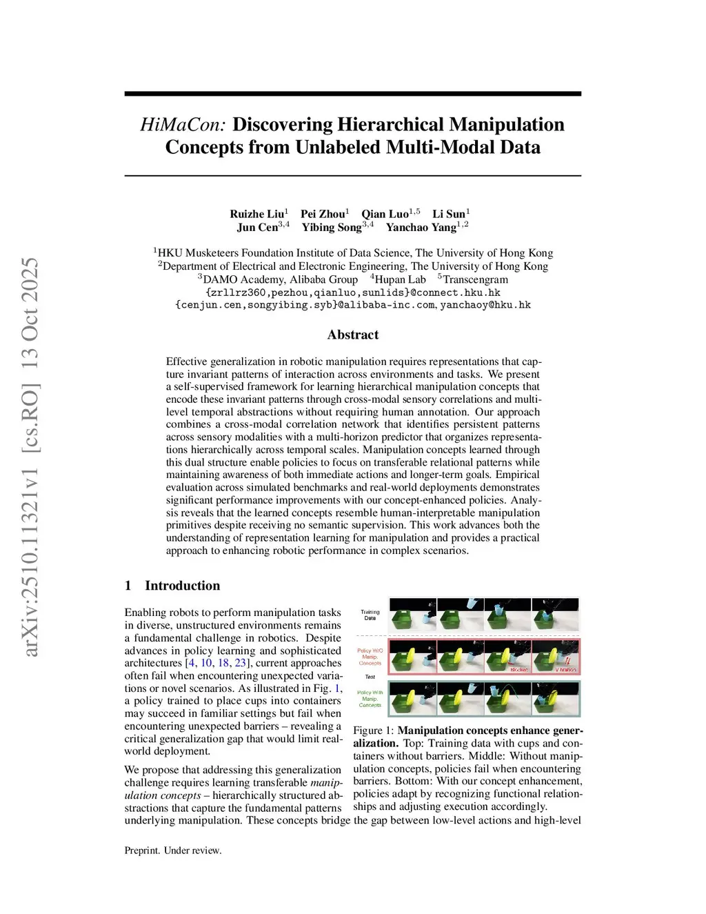 Effective generalization in robotic manipulation requires representations that capture invariant patterns of interaction across environments and tasks. We present a self-supervised framework for learning hierarchical manipulation concepts that encode these invariant patterns through cross-modal sensory correlations and multi-level temporal abstractions without requiring human annotation. Our approach combines a cross-modal correlation network that identifies persistent patterns across sensory modalities with a multi-horizon predictor that organizes representations hierarchically across temporal scales. Manipulation concepts learned through this dual structure enable policies to focus on transferable relational patterns while maintaining awareness of both immediate actions and longer-term goals. Empirical evaluation across simulated benchmarks and real-world deployments demonstrates significant performance improvements with our concept-enhanced policies. Analysis reveals that the learned concepts resemble human-interpretable manipulation primitives despite receiving no semantic supervision. This work advances both the understanding of representation learning for manipulation and provides a practical approach to enhancing robotic performance in complex scenarios.