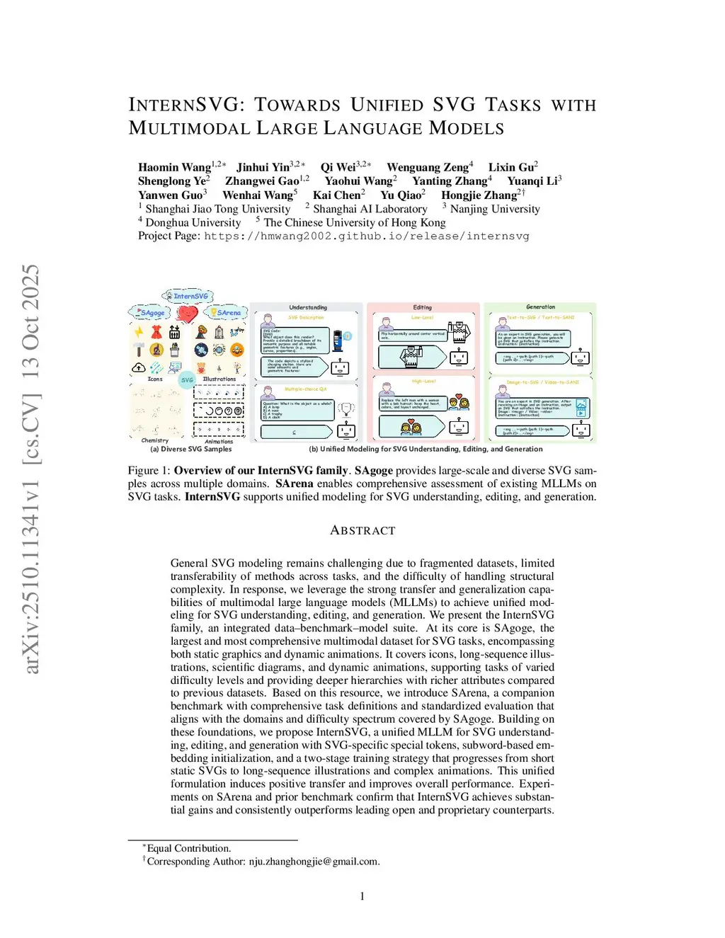 General SVG modeling remains challenging due to fragmented datasets, limited transferability of methods across tasks, and the difficulty of handling structural complexity. In response, we leverage the strong transfer and generalization capabilities of multimodal large language models (MLLMs) to achieve unified modeling for SVG understanding, editing, and generation. We present the InternSVG family, an integrated data-benchmark-model suite. At its core is SAgoge, the largest and most comprehensive multimodal dataset for SVG tasks, encompassing both static graphics and dynamic animations. It covers icons, long-sequence illustrations, scientific diagrams, and dynamic animations, supporting tasks of varied difficulty levels and providing deeper hierarchies with richer attributes compared to previous datasets. Based on this resource, we introduce SArena, a companion benchmark with comprehensive task definitions and standardized evaluation that aligns with the domains and difficulty spectrum covered by SAgoge. Building on these foundations, we propose InternSVG, a unified MLLM for SVG understanding, editing, and generation with SVG-specific special tokens, subword-based embedding initialization, and a two-stage training strategy that progresses from short static SVGs to long-sequence illustrations and complex animations. This unified formulation induces positive transfer and improves overall performance. Experiments on SArena and prior benchmark confirm that InternSVG achieves substantial gains and consistently outperforms leading open and proprietary counterparts.
