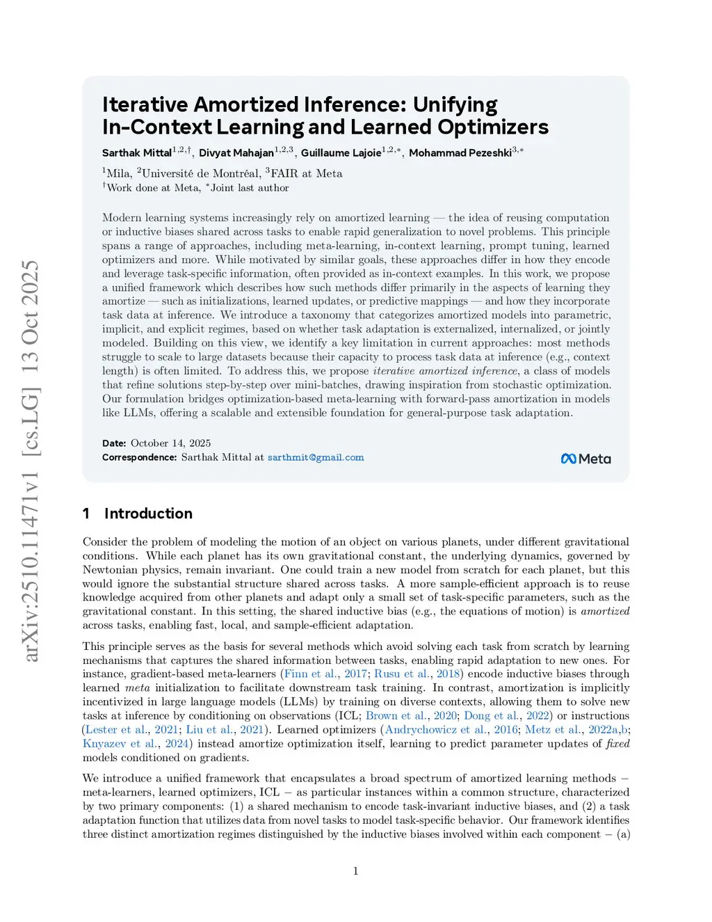 Modern learning systems increasingly rely on amortized learning - the idea of reusing computation or inductive biases shared across tasks to enable rapid generalization to novel problems. This principle spans a range of approaches, including meta-learning, in-context learning, prompt tuning, learned optimizers and more. While motivated by similar goals, these approaches differ in how they encode and leverage task-specific information, often provided as in-context examples. In this work, we propose a unified framework which describes how such methods differ primarily in the aspects of learning they amortize - such as initializations, learned updates, or predictive mappings - and how they incorporate task data at inference. We introduce a taxonomy that categorizes amortized models into parametric, implicit, and explicit regimes, based on whether task adaptation is externalized, internalized, or jointly modeled. Building on this view, we identify a key limitation in current approaches: most methods struggle to scale to large datasets because their capacity to process task data at inference (e.g., context length) is often limited. To address this, we propose iterative amortized inference, a class of models that refine solutions step-by-step over mini-batches, drawing inspiration from stochastic optimization. Our formulation bridges optimization-based meta-learning with forward-pass amortization in models like LLMs, offering a scalable and extensible foundation for general-purpose task adaptation.