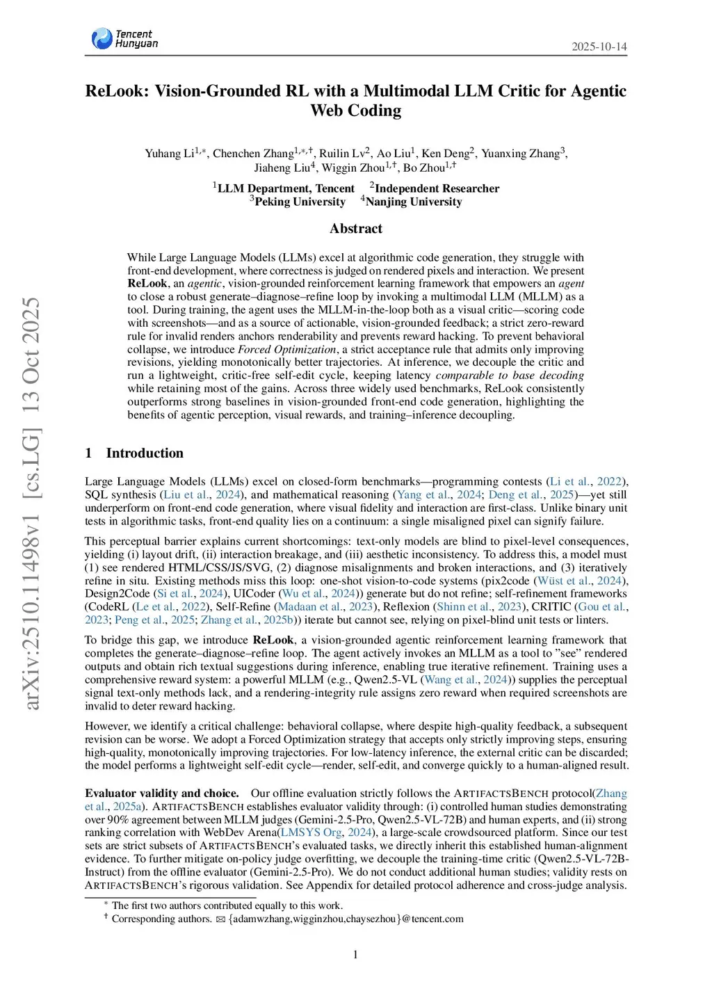ReLook: Vision-Grounded RL with a Multimodal LLM Critic for Agentic Web Coding