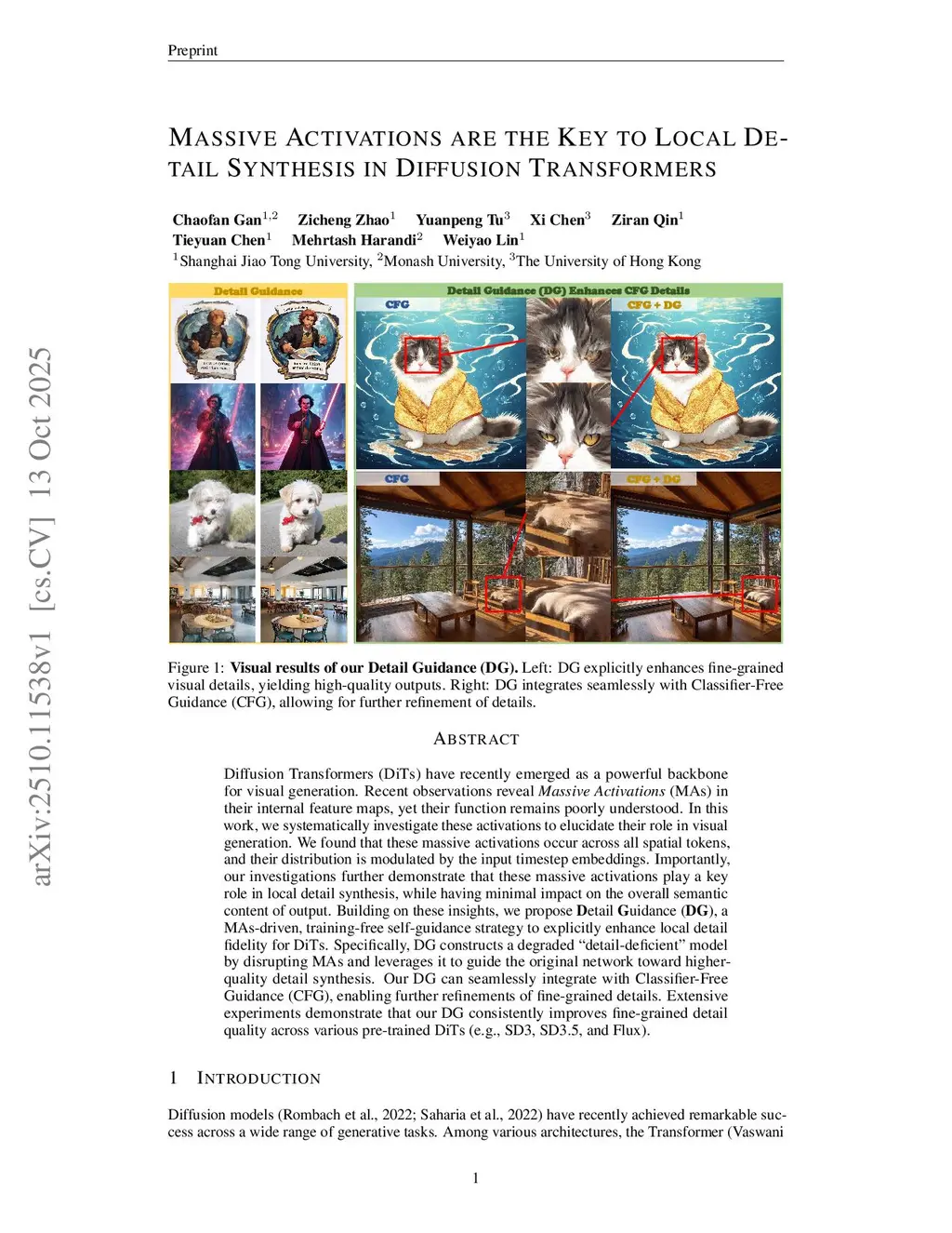Diffusion Transformers (DiTs) have recently emerged as a powerful backbone for visual generation. Recent observations reveal \emph{Massive Activations} (MAs) in their internal feature maps, yet their function remains poorly understood. In this work, we systematically investigate these activations to elucidate their role in visual generation. We found that these massive activations occur across all spatial tokens, and their distribution is modulated by the input timestep embeddings. Importantly, our investigations further demonstrate that these massive activations play a key role in local detail synthesis, while having minimal impact on the overall semantic content of output. Building on these insights, we propose \textbf{D}etail \textbf{G}uidance (\textbf{DG}), a MAs-driven, training-free self-guidance strategy to explicitly enhance local detail fidelity for DiTs. Specifically, DG constructs a degraded ``detail-deficient'' model by disrupting MAs and leverages it to guide the original network toward higher-quality detail synthesis. Our DG can seamlessly integrate with Classifier-Free Guidance (CFG), enabling further refinements of fine-grained details. Extensive experiments demonstrate that our DG consistently improves fine-grained detail quality across various pre-trained DiTs (\eg, SD3, SD3.5, and Flux).