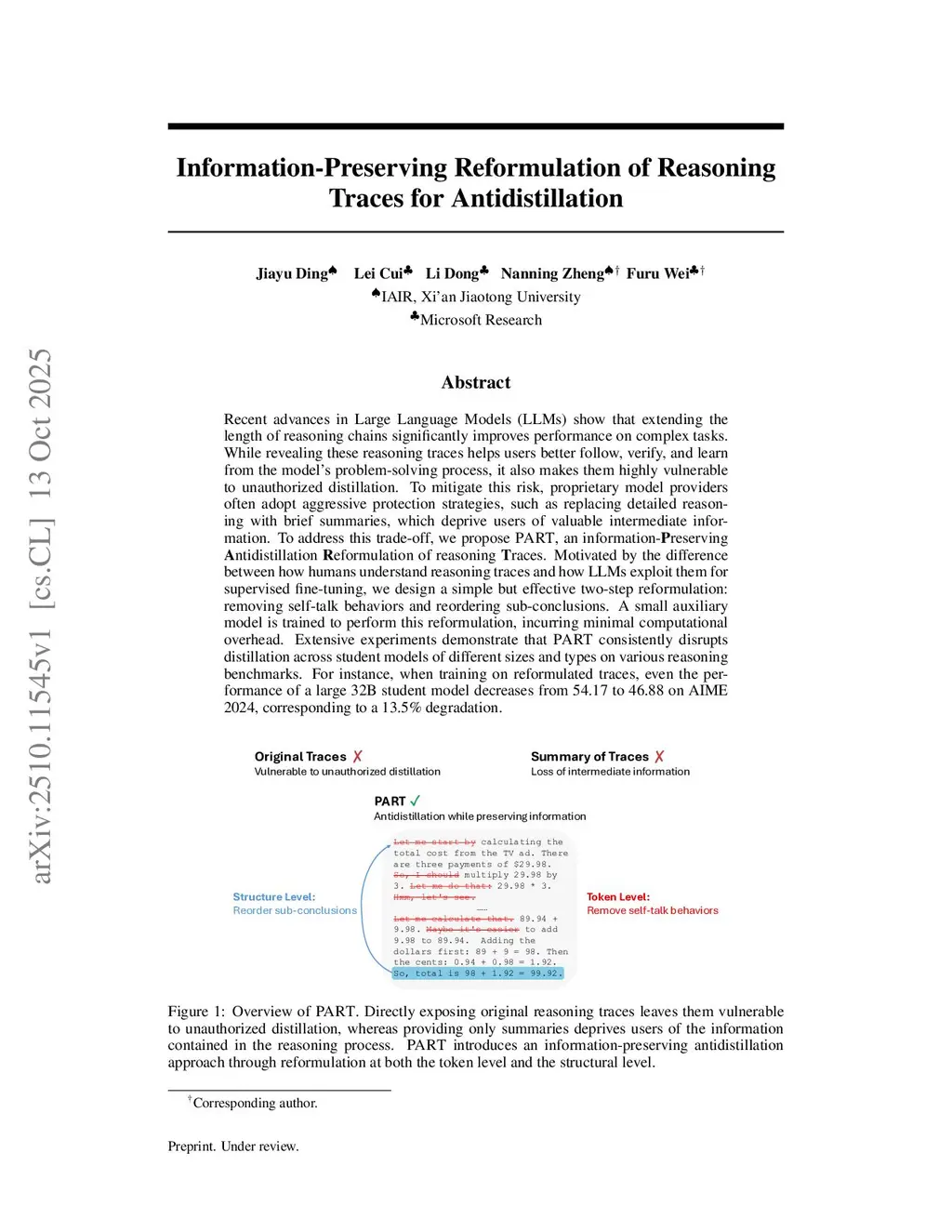 Recent advances in Large Language Models (LLMs) show that extending the length of reasoning chains significantly improves performance on complex tasks. While revealing these reasoning traces helps users better follow, verify, and learn from the model's problem-solving process, it also makes them highly vulnerable to unauthorized distillation. To mitigate this risk, proprietary model providers often adopt aggressive protection strategies, such as replacing detailed reasoning with brief summaries, which deprive users of valuable intermediate information. To address this trade-off, we propose PART, an information-preserving antidistillation reformulation of reasoning traces. Motivated by the difference between how humans understand reasoning traces and how LLMs exploit them for supervised fine-tuning, we design a simple but effective two-step reformulation: removing self-talk behaviors and reordering sub-conclusions. A small auxiliary model is trained to perform this reformulation, incurring minimal computational overhead. Extensive experiments demonstrate that PART consistently disrupts distillation across student models of different sizes and types on various reasoning benchmarks. For instance, when training on reformulated traces, even the performance of a large 32B student model decreases from 54.17 to 46.88 on AIME 2024, corresponding to a 13.5% degradation.