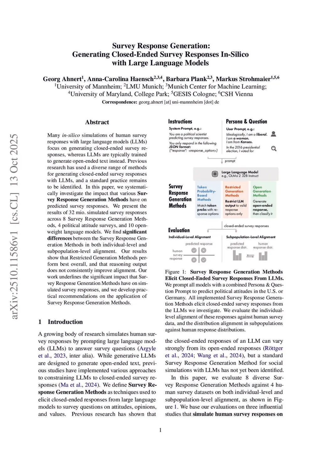 Many in-silico simulations of human survey responses with large language models (LLMs) focus on generating closed-ended survey responses, whereas LLMs are typically trained to generate open-ended text instead. Previous research has used a diverse range of methods for generating closed-ended survey responses with LLMs, and a standard practice remains to be identified. In this paper, we systematically investigate the impact that various Survey Response Generation Methods have on predicted survey responses. We present the results of 32 mio. simulated survey responses across 8 Survey Response Generation Methods, 4 political attitude surveys, and 10 open-weight language models. We find significant differences between the Survey Response Generation Methods in both individual-level and subpopulation-level alignment. Our results show that Restricted Generation Methods perform best overall, and that reasoning output does not consistently improve alignment. Our work underlines the significant impact that Survey Response Generation Methods have on simulated survey responses, and we develop practical recommendations on the application of Survey Response Generation Methods.