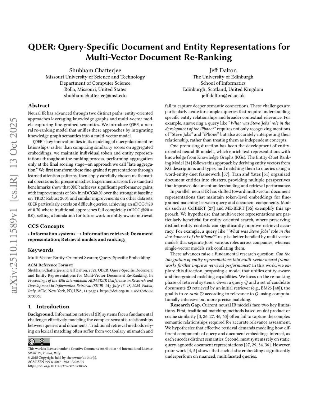 Neural IR has advanced through two distinct paths: entity-oriented approaches leveraging knowledge graphs and multi-vector models capturing fine-grained semantics. We introduce QDER, a neural re-ranking model that unifies these approaches by integrating knowledge graph semantics into a multi-vector model. QDER's key innovation lies in its modeling of query-document relationships: rather than computing similarity scores on aggregated embeddings, we maintain individual token and entity representations throughout the ranking process, performing aggregation only at the final scoring stage - an approach we call "late aggregation." We first transform these fine-grained representations through learned attention patterns, then apply carefully chosen mathematical operations for precise matches. Experiments across five standard benchmarks show that QDER achieves significant performance gains, with improvements of 36% in nDCG@20 over the strongest baseline on TREC Robust 2004 and similar improvements on other datasets. QDER particularly excels on difficult queries, achieving an nDCG@20 of 0.70 where traditional approaches fail completely (nDCG@20 = 0.0), setting a foundation for future work in entity-aware retrieval.