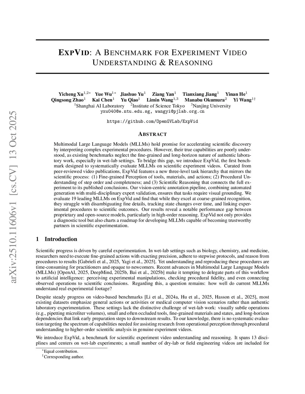ExpVid: A Benchmark for Experiment Video Understanding & Reasoning