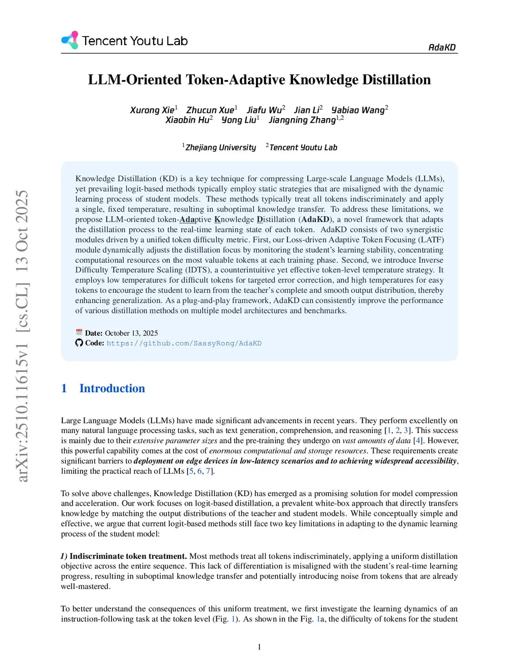 Knowledge distillation (KD) is a key technique for compressing large-scale language models (LLMs), yet prevailing logit-based methods typically employ static strategies that are misaligned with the dynamic learning process of student models. These methods typically treat all tokens indiscriminately and apply a single, fixed temperature, resulting in suboptimal knowledge transfer. To address these limitations, we propose LLM-Oriented Token-Adaptive Knowledge Distillation (AdaKD), a novel framework that adapts the distillation process to the real-time learning state of each token. AdaKD consists of two synergistic modules driven by a unified token difficulty metric. First, our Loss-Driven Adaptive Token Focusing (LATF) module dynamically adjusts the distillation focus by monitoring the student's learning stability, concentrating computational resources on the most valuable tokens at each training phase. Second, we introduce Inverse Difficulty Temperature Scaling (IDTS), a counterintuitive yet effective token-level temperature strategy. It employs low temperatures for difficult tokens for targeted error correction, and high temperatures for easy tokens to encourage students to learn from the teacher's complete and smooth output distribution, thereby enhancing generalization. As a plug-and-play framework, AdaKD can consistently improve the performance of various distillation methods on multiple model architectures and benchmarks.