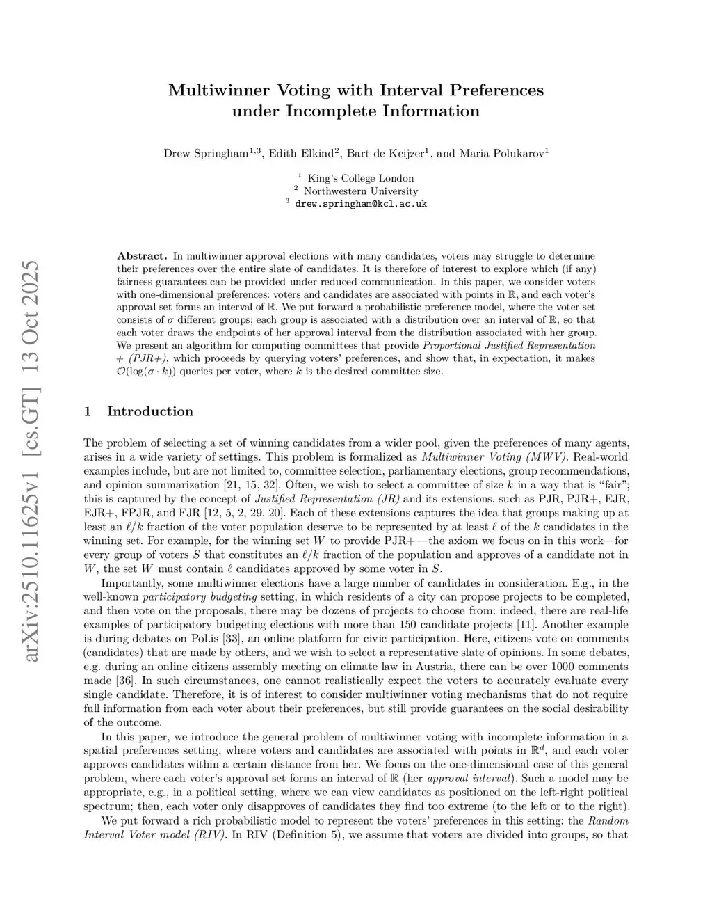 In multiwinner approval elections with many candidates, voters may struggle to determine their preferences over the entire slate of candidates. It is therefore of interest to explore which (if any) fairness guarantees can be provided under reduced communication. In this paper, we consider voters with one-dimensional preferences: voters and candidates are associated with points in , and each voter's approval set forms an interval of . We put forward a probabilistic preference model, where the voter set consists of different groups; each group is associated with a distribution over an interval of , so that each voter draws the endpoints of her approval interval from the distribution associated with her group. We present an algorithm for computing committees that provide Proportional Justified Representation + (PJR+), which proceeds by querying voters' preferences, and show that, in expectation, it makes queries per voter, where is the desired committee size.