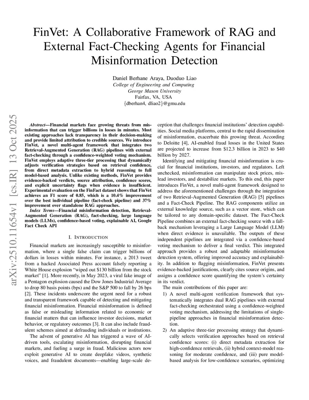 Financial markets face growing threats from misinformation that can trigger billions in losses in minutes. Most existing approaches lack transparency in their decision-making and provide limited attribution to credible sources. We introduce FinVet, a novel multi-agent framework that integrates two Retrieval-Augmented Generation (RAG) pipelines with external fact-checking through a confidence-weighted voting mechanism. FinVet employs adaptive three-tier processing that dynamically adjusts verification strategies based on retrieval confidence, from direct metadata extraction to hybrid reasoning to full model-based analysis. Unlike existing methods, FinVet provides evidence-backed verdicts, source attribution, confidence scores, and explicit uncertainty flags when evidence is insufficient. Experimental evaluation on the FinFact dataset shows that FinVet achieves an F1 score of 0.85, which is a 10.4% improvement over the best individual pipeline (fact-check pipeline) and 37% improvement over standalone RAG approaches.