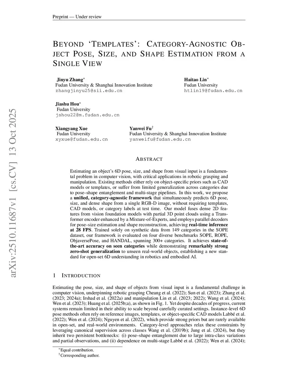Estimating an object's 6D pose, size, and shape from visual input is a fundamental problem in computer vision, with critical applications in robotic grasping and manipulation. Existing methods either rely on object-specific priors such as CAD models or templates, or suffer from limited generalization across categories due to pose-shape entanglement and multi-stage pipelines. In this work, we propose a unified, category-agnostic framework that simultaneously predicts 6D pose, size, and dense shape from a single RGB-D image, without requiring templates, CAD models, or category labels at test time. Our model fuses dense 2D features from vision foundation models with partial 3D point clouds using a Transformer encoder enhanced by a Mixture-of-Experts, and employs parallel decoders for pose-size estimation and shape reconstruction, achieving real-time inference at 28 FPS. Trained solely on synthetic data from 149 categories in the SOPE dataset, our framework is evaluated on four diverse benchmarks SOPE, ROPE, ObjaversePose, and HANDAL, spanning over 300 categories. It achieves state-of-the-art accuracy on seen categories while demonstrating remarkably strong zero-shot generalization to unseen real-world objects, establishing a new standard for open-set 6D understanding in robotics and embodied AI.