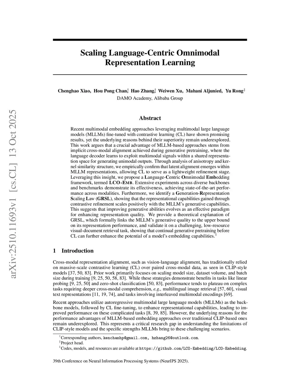 Recent multimodal embedding approaches leveraging multimodal large language models (MLLMs) fine-tuned with contrastive learning (CL) have shown promising results, yet the underlying reasons behind their superiority remain underexplored. This work argues that a crucial advantage of MLLM-based approaches stems from implicit cross-modal alignment achieved during generative pretraining, where the language decoder learns to exploit multimodal signals within a shared representation space for generating unimodal outputs. Through analysis of anisotropy and kernel similarity structure, we empirically confirm that latent alignment emerges within MLLM representations, allowing CL to serve as a lightweight refinement stage. Leveraging this insight, we propose a Language-Centric Omnimodal Embedding framework, termed LCO-Emb. Extensive experiments across diverse backbones and benchmarks demonstrate its effectiveness, achieving state-of-the-art performance across modalities. Furthermore, we identify a Generation-Representation Scaling Law (GRSL), showing that the representational capabilities gained through contrastive refinement scales positively with the MLLM's generative capabilities. This suggests that improving generative abilities evolves as an effective paradigm for enhancing representation quality. We provide a theoretical explanation of GRSL, which formally links the MLLM's generative quality to the upper bound on its representation performance, and validate it on a challenging, low-resource visual-document retrieval task, showing that continual generative pretraining before CL can further enhance the potential of a model's embedding capabilities. Codes, models, and resources are available atthis https URL.