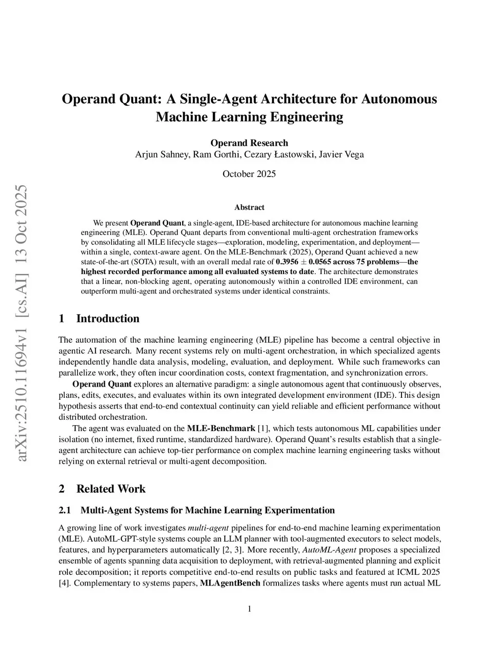 We present Operand Quant, a single-agent, IDE-based architecture for autonomous machine learning engineering (MLE). Operand Quant departs from conventional multi-agent orchestration frameworks by consolidating all MLE lifecycle stages -- exploration, modeling, experimentation, and deployment -- within a single, context-aware agent. On the MLE-Benchmark (2025), Operand Quant achieved a new state-of-the-art (SOTA) result, with an overall medal rate of 0.3956 +/- 0.0565 across 75 problems -- the highest recorded performance among all evaluated systems to date. The architecture demonstrates that a linear, non-blocking agent, operating autonomously within a controlled IDE environment, can outperform multi-agent and orchestrated systems under identical constraints.