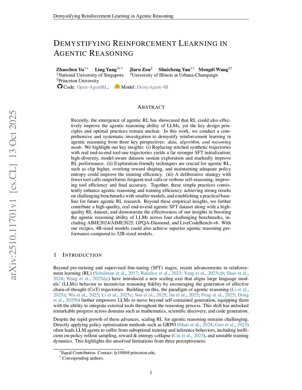 Recently, the emergence of agentic RL has showcased that RL could also effectively improve the agentic reasoning ability of LLMs, yet the key design principles and optimal practices remain unclear. In this work, we conduct a comprehensive and systematic investigation to demystify reinforcement learning in agentic reasoning from three key perspectives: data, algorithm, and reasoning mode. We highlight our key insights: (i) Replacing stitched synthetic trajectories with real end-to-end tool-use trajectories yields a far stronger SFT initialization; high-diversity, model-aware datasets sustain exploration and markedly improve RL performance. (ii) Exploration-friendly techniques are crucial for agentic RL, such as clip higher, overlong reward shaping, and maintaining adequate policy entropy could improve the training efficiency. (iii) A deliberative strategy with fewer tool calls outperforms frequent tool calls or verbose self-reasoning, improving tool efficiency and final accuracy. Together, these simple practices consistently enhance agentic reasoning and training efficiency, achieving strong results on challenging benchmarks with smaller models, and establishing a practical baseline for future agentic RL research. Beyond these empirical insights, we further contribute a high-quality, real end-to-end agentic SFT dataset along with a high-quality RL dataset, and demonstrate the effectiveness of our insights in boosting the agentic reasoning ability of LLMs across four challenging benchmarks, including AIME2024/AIME2025, GPQA-Diamond, and LiveCodeBench-v6. With our recipes, 4B-sized models could also achieve superior agentic reasoning performance compared to 32B-sized models. Code and models:this https URL