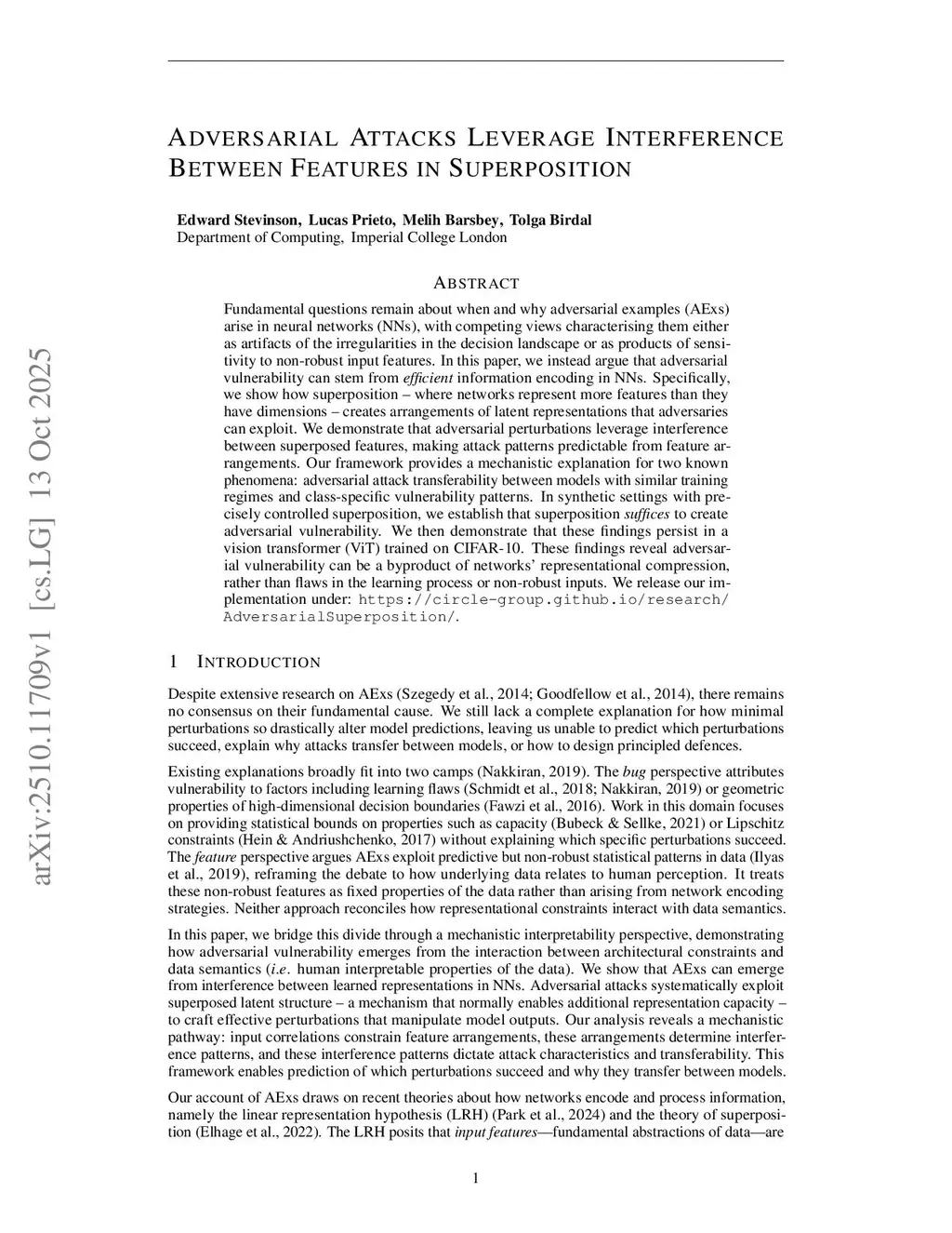 Fundamental questions remain about when and why adversarial examples arise in neural networks, with competing views characterising them either as artifacts of the irregularities in the decision landscape or as products of sensitivity to non-robust input features. In this paper, we instead argue that adversarial vulnerability can stem from efficient information encoding in neural networks. Specifically, we show how superposition - where networks represent more features than they have dimensions - creates arrangements of latent representations that adversaries can exploit. We demonstrate that adversarial perturbations leverage interference between superposed features, making attack patterns predictable from feature arrangements. Our framework provides a mechanistic explanation for two known phenomena: adversarial attack transferability between models with similar training regimes and class-specific vulnerability patterns. In synthetic settings with precisely controlled superposition, we establish that superposition suffices to create adversarial vulnerability. We then demonstrate that these findings persist in a ViT trained on CIFAR-10. These findings reveal adversarial vulnerability can be a byproduct of networks' representational compression, rather than flaws in the learning process or non-robust inputs.