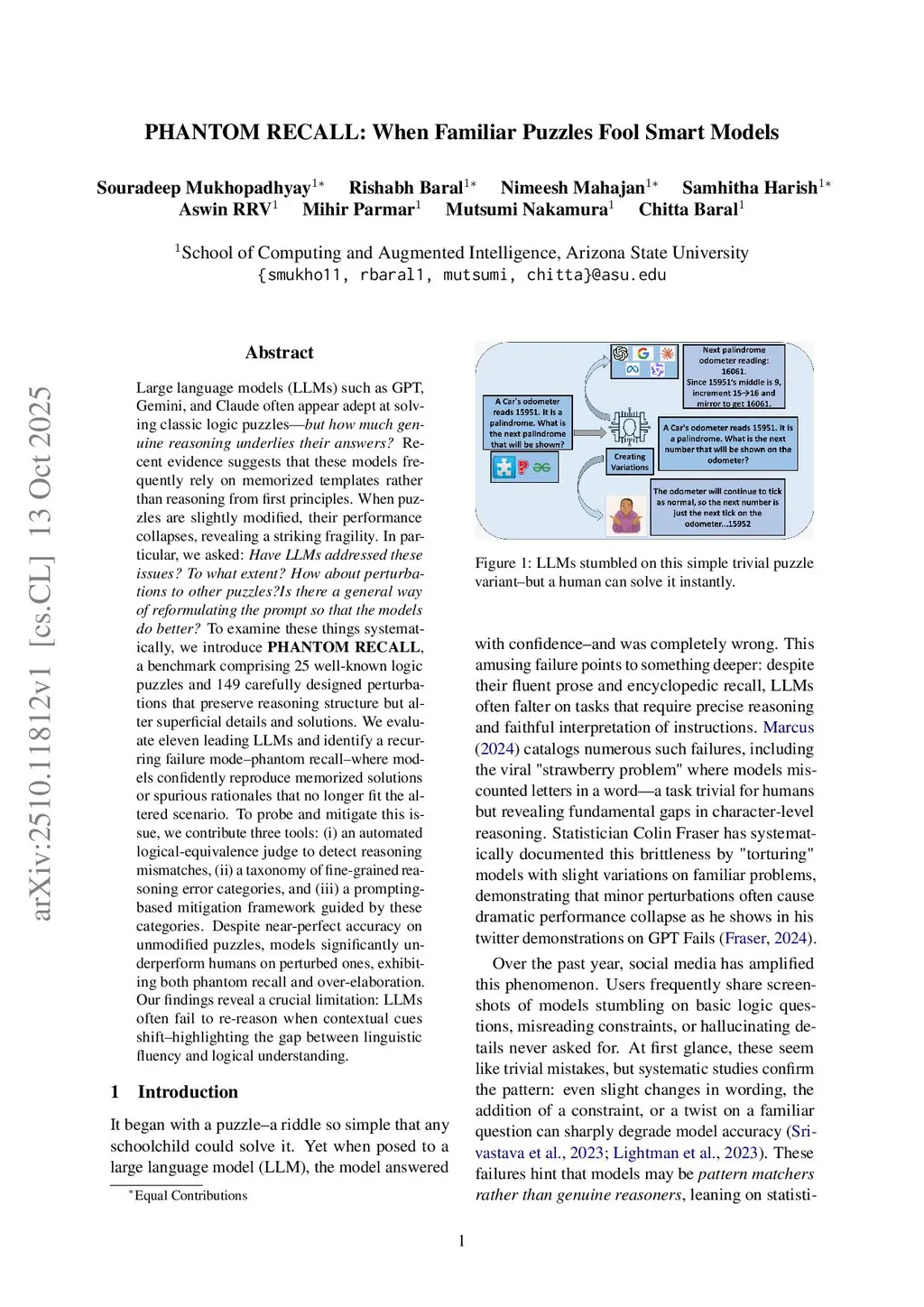 Large language models (LLMs) such as GPT, Gemini, and Claude often appear adept at solving classic logic puzzles--but how much genuine reasoning underlies their answers? Recent evidence suggests that these models frequently rely on memorized templates rather than reasoning from first principles. When puzzles are slightly modified, their performance collapses, revealing a striking fragility. In particular, we asked: Have LLMs addressed these issues? To what extent? How about perturbations to other puzzles? Is there a general way of reformulating the prompt so that the models do better? To examine these things systematically, we introduce PHANTOM RECALL, a benchmark comprising 25 well-known logic puzzles and 149 carefully designed perturbations that preserve reasoning structure but alter superficial details and solutions. We evaluate eleven leading LLMs and identify a recurring failure mode--phantom recall--where models confidently reproduce memorized solutions or spurious rationales that no longer fit the altered scenario. To probe and mitigate this issue, we contribute three tools: (i) an automated logical-equivalence judge to detect reasoning mismatches, (ii) a taxonomy of fine-grained reasoning error categories, and (iii) a prompting-based mitigation framework guided by these categories. Despite near-perfect accuracy on unmodified puzzles, models significantly underperform humans on perturbed ones, exhibiting both phantom recall and over-elaboration. Our findings reveal a crucial limitation: LLMs often fail to re-reason when contextual cues shift--highlighting the gap between linguistic fluency and logical understanding.
