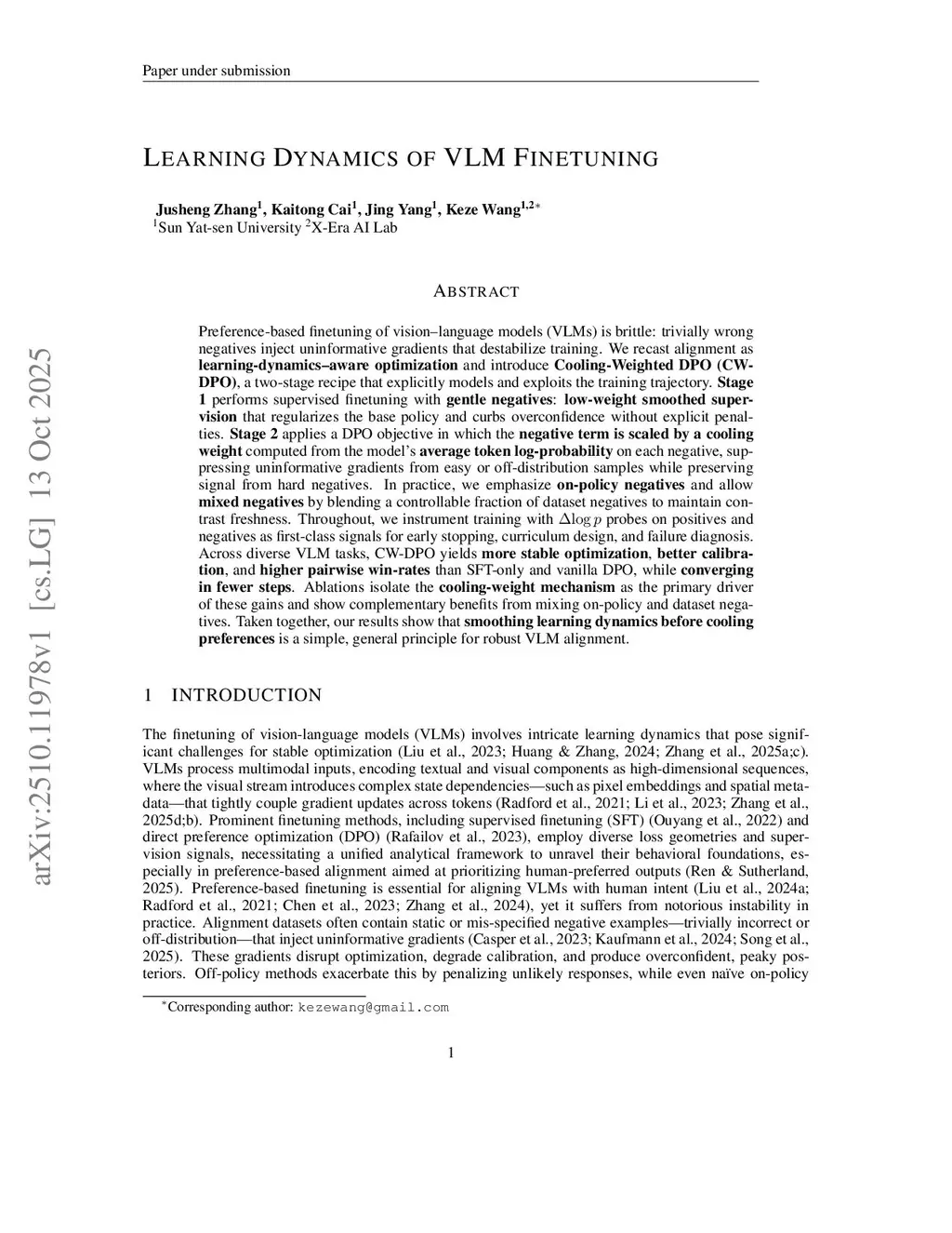 Preference-based finetuning of vision--language models (VLMs) is brittle: trivially wrong negatives inject uninformative gradients that destabilize training. We recast alignment as \textbf{learning-dynamics--aware optimization} and introduce \textbf{Cooling-Weighted DPO (CW-DPO)}, a two-stage recipe that explicitly models and exploits the training trajectory. \textbf{Stage 1} performs supervised finetuning with \textbf{gentle negatives}: \textbf{low-weight smoothed supervision} that regularizes the base policy and curbs overconfidence without explicit penalties. \textbf{Stage 2} applies a DPO objective in which the \textbf{negative term is scaled by a cooling weight} computed from the model's \textbf{average token log-probability} on each negative, suppressing uninformative gradients from easy or off-distribution samples while preserving signal from hard negatives. In practice, we emphasize \textbf{on-policy negatives} and allow \textbf{mixed negatives} by blending a controllable fraction of dataset negatives to maintain contrast freshness. Throughout, we instrument training with probes on positives and negatives as first-class signals for early stopping, curriculum design, and failure diagnosis. Across diverse VLM tasks, CW-DPO yields \textbf{more stable optimization}, \textbf{better calibration}, and \textbf{higher pairwise win-rates} than SFT-only and vanilla DPO, while \textbf{converging in fewer steps}. Ablations isolate the \textbf{cooling-weight mechanism} as the primary driver of these gains and show complementary benefits from mixing on-policy and dataset negatives. Taken together, our results show that \textbf{smoothing learning dynamics before cooling preferences} is a simple, general principle for robust VLM alignment.