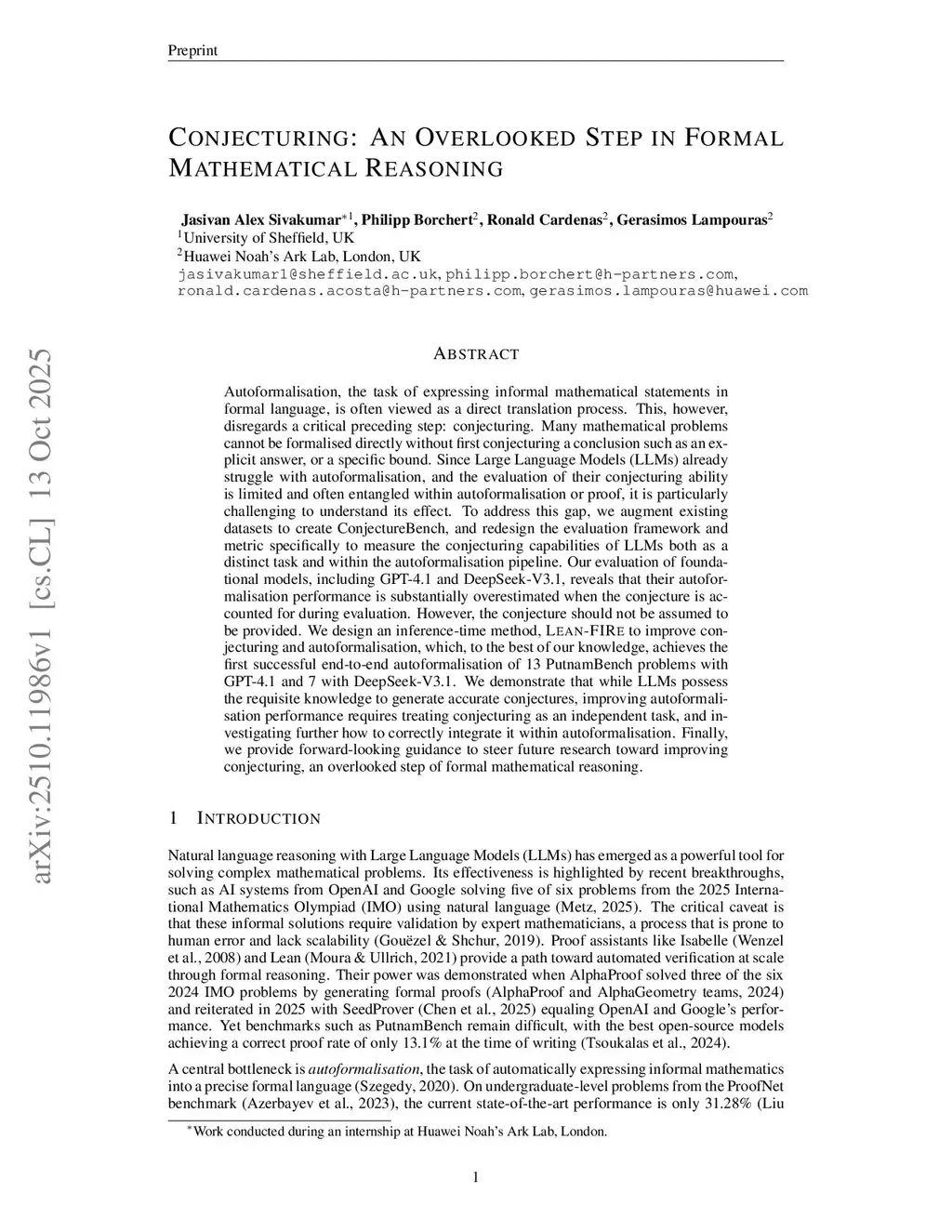 Autoformalisation, the task of expressing informal mathematical statements in formal language, is often viewed as a direct translation process. This, however, disregards a critical preceding step: conjecturing. Many mathematical problems cannot be formalised directly without first conjecturing a conclusion such as an explicit answer, or a specific bound. Since Large Language Models (LLMs) already struggle with autoformalisation, and the evaluation of their conjecturing ability is limited and often entangled within autoformalisation or proof, it is particularly challenging to understand its effect. To address this gap, we augment existing datasets to create ConjectureBench, and redesign the evaluation framework and metric specifically to measure the conjecturing capabilities of LLMs both as a distinct task and within the autoformalisation pipeline. Our evaluation of foundational models, including GPT-4.1 and DeepSeek-V3.1, reveals that their autoformalisation performance is substantially overestimated when the conjecture is accounted for during evaluation. However, the conjecture should not be assumed to be provided. We design an inference-time method, Lean-FIRe to improve conjecturing and autoformalisation, which, to the best of our knowledge, achieves the first successful end-to-end autoformalisation of 13 PutnamBench problems with GPT-4.1 and 7 with DeepSeek-V3.1. We demonstrate that while LLMs possess the requisite knowledge to generate accurate conjectures, improving autoformalisation performance requires treating conjecturing as an independent task, and investigating further how to correctly integrate it within autoformalisation. Finally, we provide forward-looking guidance to steer future research toward improving conjecturing, an overlooked step of formal mathematical reasoning.