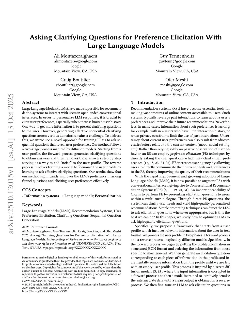 Large Language Models (LLMs) have made it possible for recommendation systems to interact with users in open-ended conversational interfaces. In order to personalize LLM responses, it is crucial to elicit user preferences, especially when there is limited user history. One way to get more information is to present clarifying questions to the user. However, generating effective sequential clarifying questions across various domains remains a challenge. To address this, we introduce a novel approach for training LLMs to ask sequential questions that reveal user preferences. Our method follows a two-stage process inspired by diffusion models. Starting from a user profile, the forward process generates clarifying questions to obtain answers and then removes those answers step by step, serving as a way to add ``noise'' to the user profile. The reverse process involves training a model to ``denoise'' the user profile by learning to ask effective clarifying questions. Our results show that our method significantly improves the LLM's proficiency in asking funnel questions and eliciting user preferences effectively.