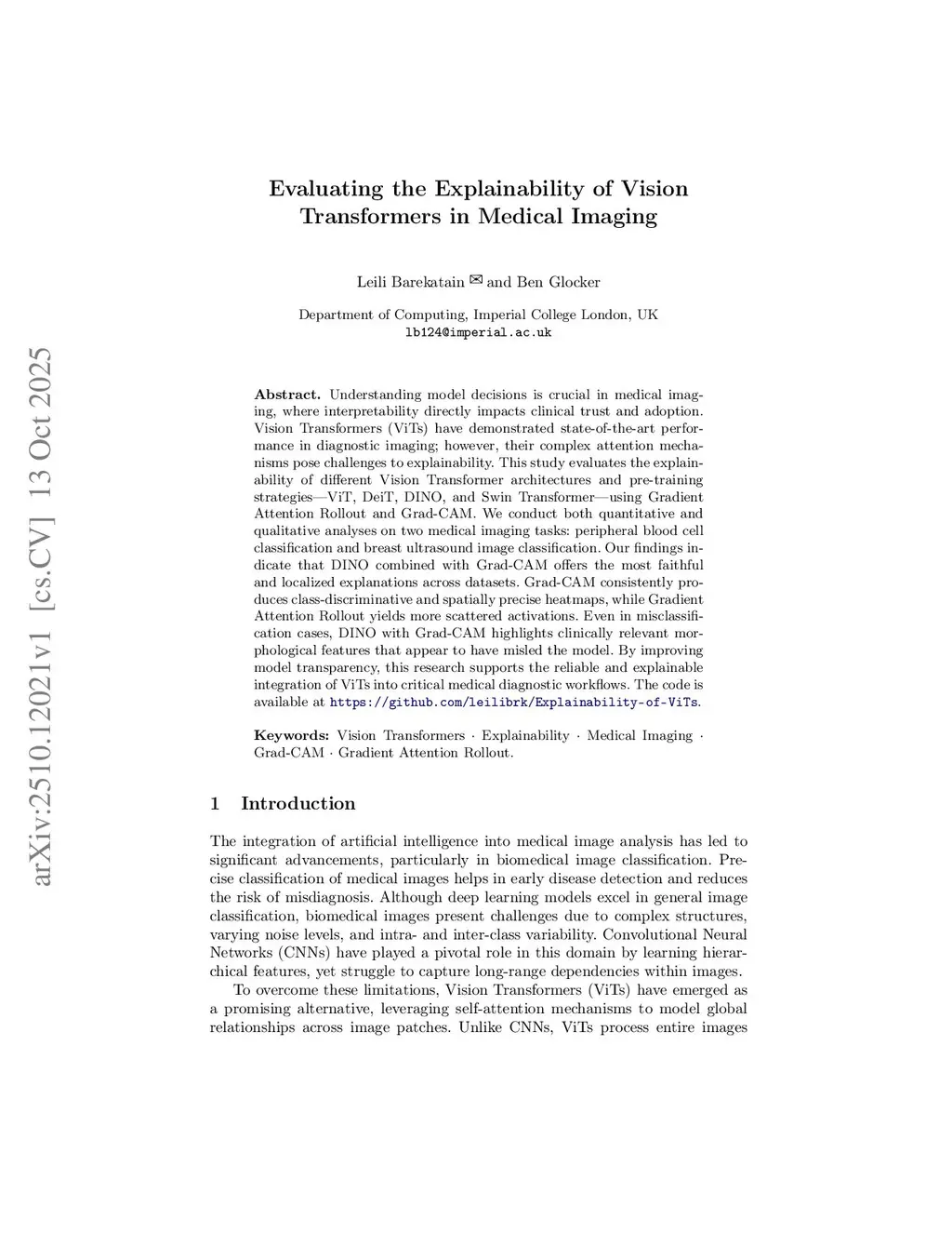 Evaluating the Explainability of Vision Transformers in Medical Imaging
