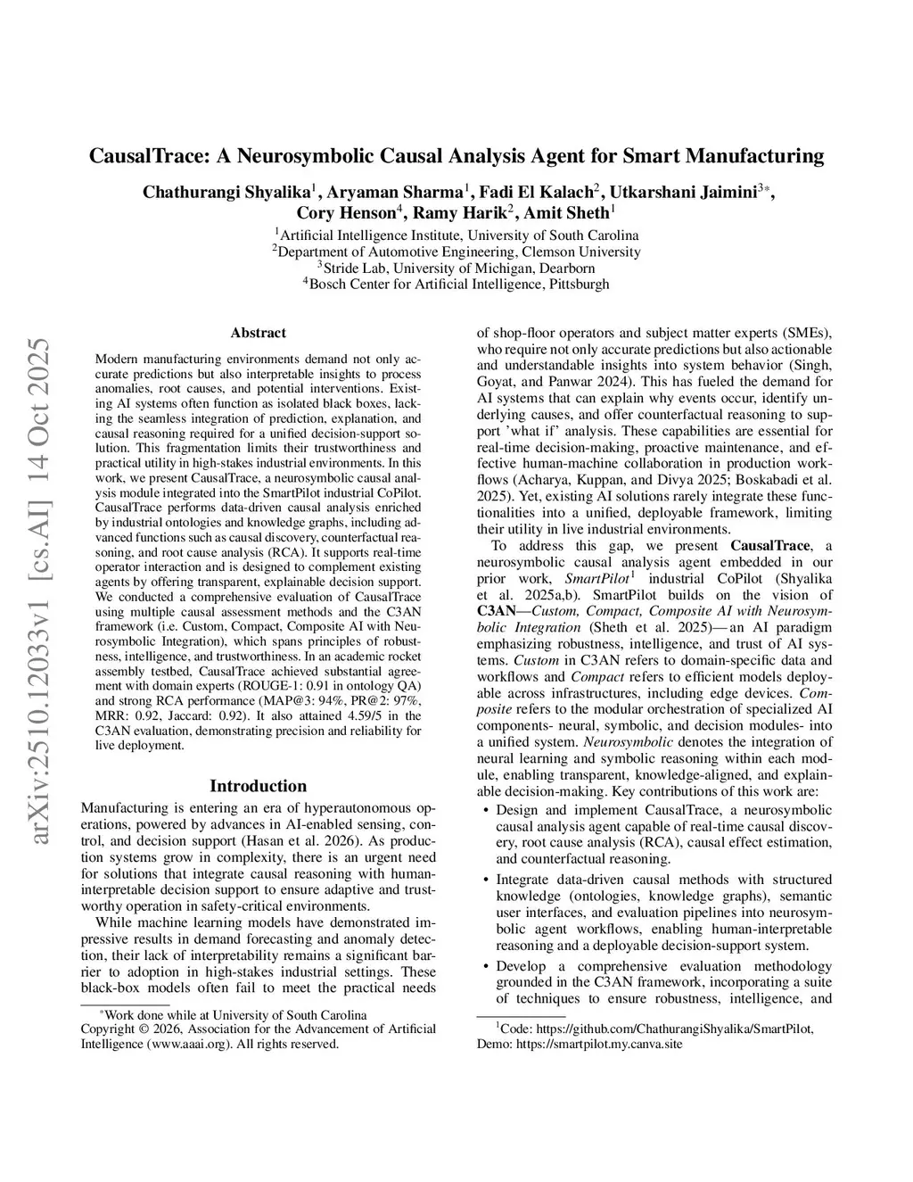 Modern manufacturing environments demand not only accurate predictions but also interpretable insights to process anomalies, root causes, and potential interventions. Existing AI systems often function as isolated black boxes, lacking the seamless integration of prediction, explanation, and causal reasoning required for a unified decision-support solution. This fragmentation limits their trustworthiness and practical utility in high-stakes industrial environments. In this work, we present CausalTrace, a neurosymbolic causal analysis module integrated into the SmartPilot industrial CoPilot. CausalTrace performs data-driven causal analysis enriched by industrial ontologies and knowledge graphs, including advanced functions such as causal discovery, counterfactual reasoning, and root cause analysis (RCA). It supports real-time operator interaction and is designed to complement existing agents by offering transparent, explainable decision support. We conducted a comprehensive evaluation of CausalTrace using multiple causal assessment methods and the C3AN framework (i.e. Custom, Compact, Composite AI with Neurosymbolic Integration), which spans principles of robustness, intelligence, and trustworthiness. In an academic rocket assembly testbed, CausalTrace achieved substantial agreement with domain experts (ROUGE-1: 0.91 in ontology QA) and strong RCA performance (MAP@3: 94%, PR@2: 97%, MRR: 0.92, Jaccard: 0.92). It also attained 4.59/5 in the C3AN evaluation, demonstrating precision and reliability for live deployment.
