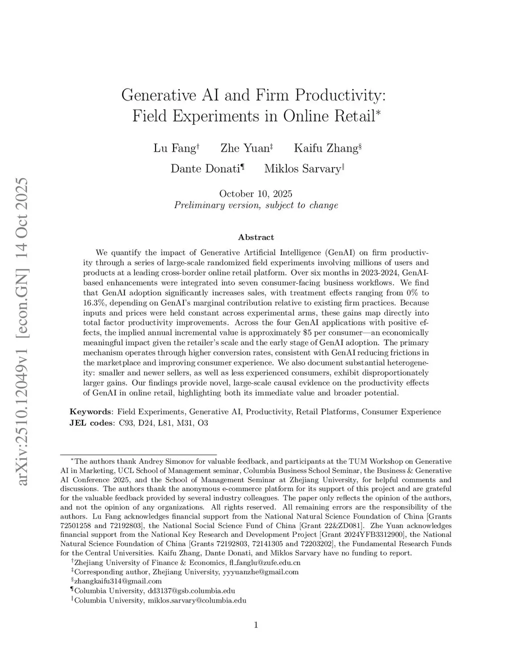 We quantify the impact of Generative Artificial Intelligence (GenAI) on firm productivity through a series of large-scale randomized field experiments involving millions of users and products at a leading cross-border online retail platform. Over six months in 2023-2024, GenAI-based enhancements were integrated into seven consumer-facing business workflows. We find that GenAI adoption significantly increases sales, with treatment effects ranging from to , depending on GenAI's marginal contribution relative to existing firm practices. Because inputs and prices were held constant across experimental arms, these gains map directly into total factor productivity improvements. Across the four GenAI applications with positive sales effects, the implied annual incremental value is approximately \ 5$ per consumer-an economically meaningful impact given the retailer's scale and the early stage of GenAI adoption. The primary mechanism operates through higher conversion rates, consistent with GenAI reducing frictions and improving consumer experience. Importantly, these effects are not associated with worse post-purchase outcomes, as product return rates and customer ratings do not deteriorate. Finally, we document substantial demand-side heterogeneity, with larger gains for less experienced consumers. Our findings provide novel, large-scale causal evidence on the productivity effects of GenAI in online retail, highlighting both its immediate value and broader potential.