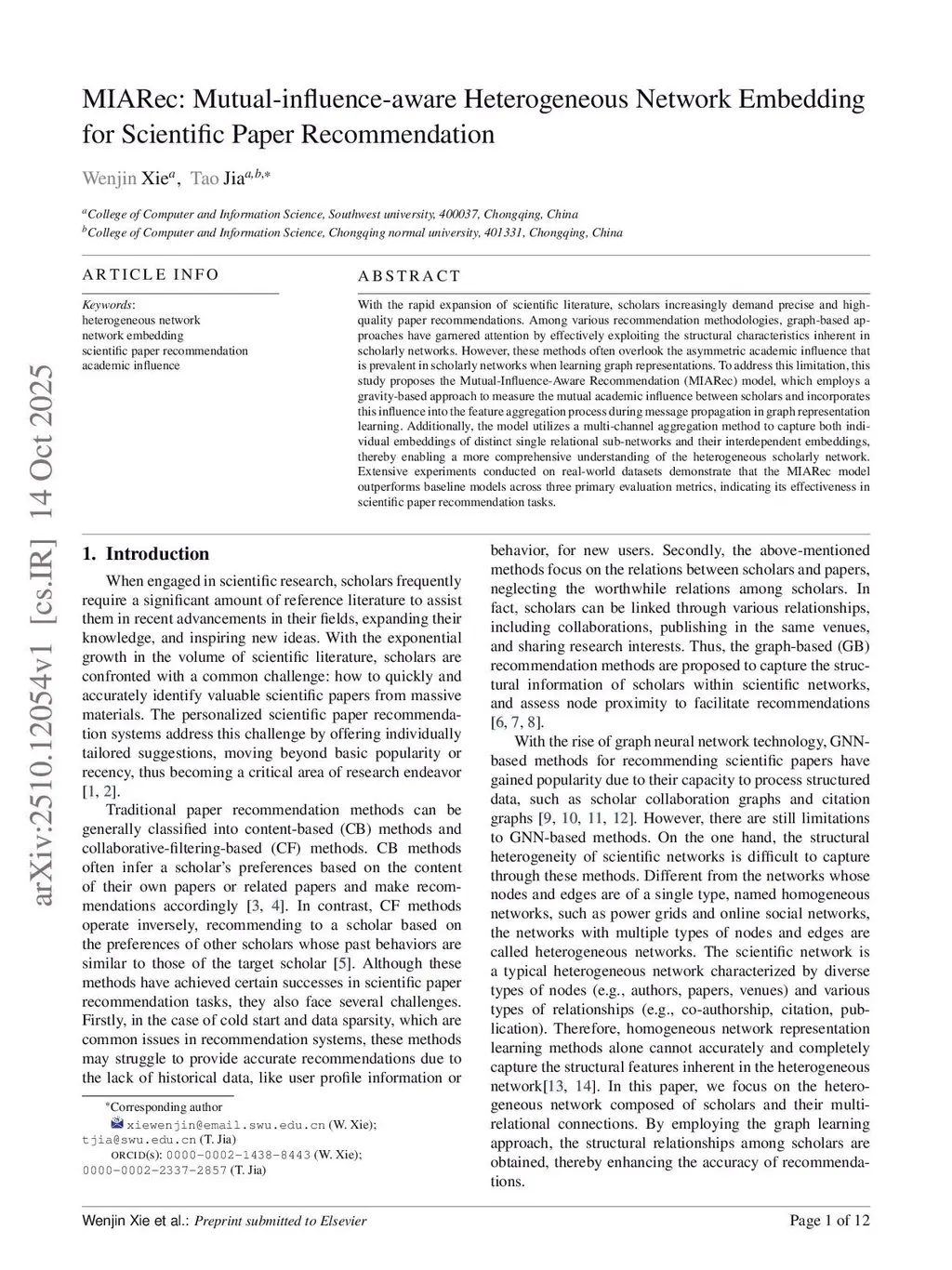 MIARec: Mutual-influence-aware Heterogeneous Network Embedding for Scientific Paper Recommendation