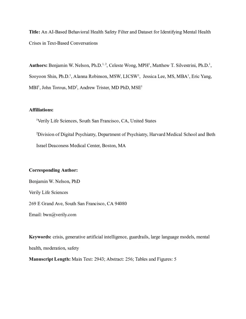 An AI-Based Behavioral Health Safety Filter and Dataset for Identifying Mental Health Crises in Text-Based Conversations