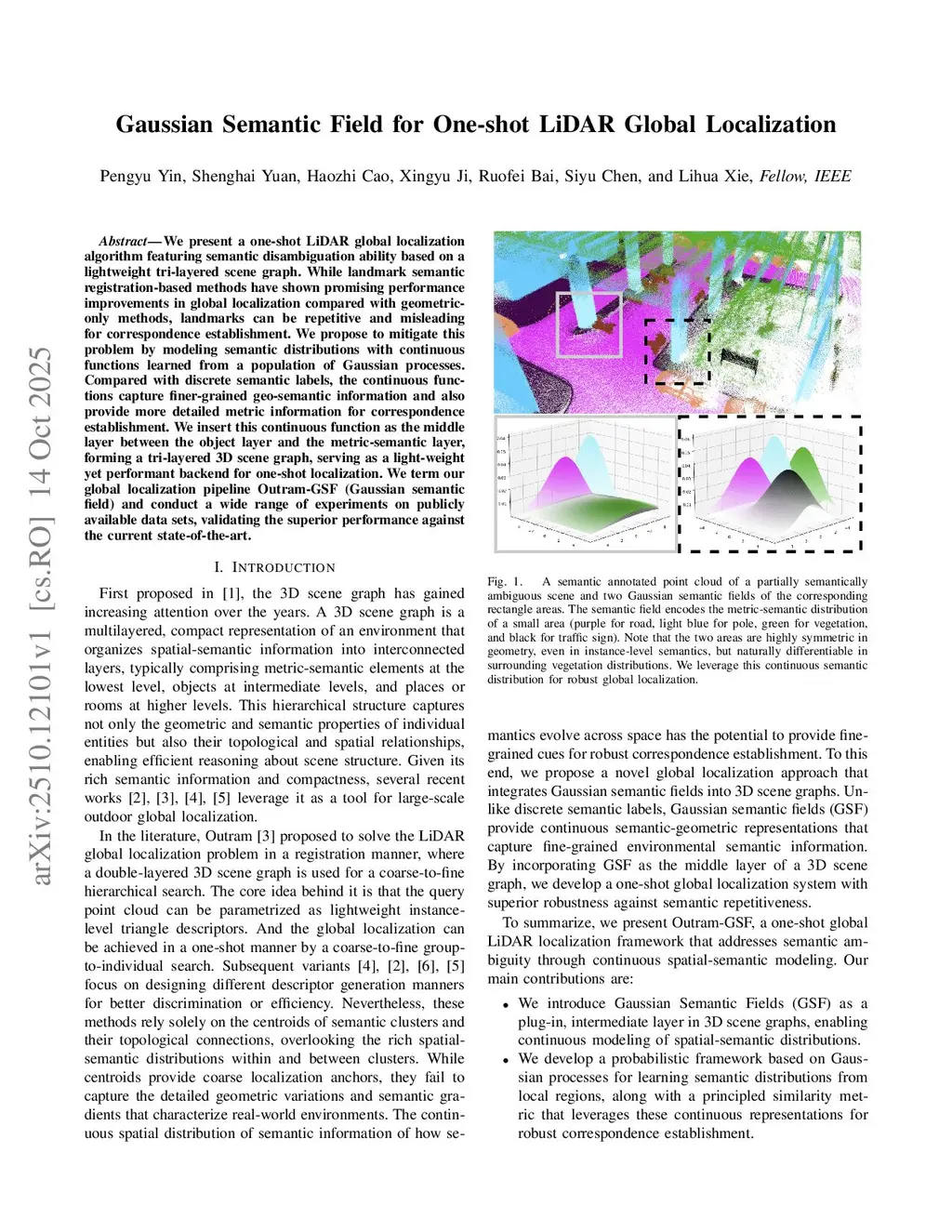 We present a one-shot LiDAR global localization algorithm featuring semantic disambiguation ability based on a lightweight tri-layered scene graph. While landmark semantic registration-based methods have shown promising performance improvements in global localization compared with geometric-only methods, landmarks can be repetitive and misleading for correspondence establishment. We propose to mitigate this problem by modeling semantic distributions with continuous functions learned from a population of Gaussian processes. Compared with discrete semantic labels, the continuous functions capture finer-grained geo-semantic information and also provide more detailed metric information for correspondence establishment. We insert this continuous function as the middle layer between the object layer and the metric-semantic layer, forming a tri-layered 3D scene graph, serving as a light-weight yet performant backend for one-shot localization. We term our global localization pipeline Outram-GSF (Gaussian semantic field) and conduct a wide range of experiments on publicly available data sets, validating the superior performance against the current state-of-the-art.