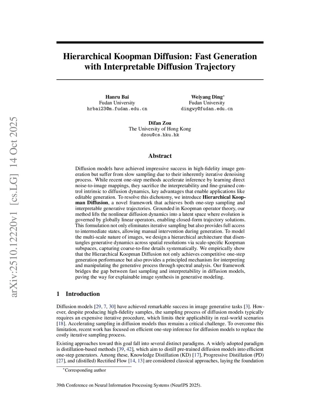 Diffusion models have achieved impressive success in high-fidelity image generation but suffer from slow sampling due to their inherently iterative denoising process. While recent one-step methods accelerate inference by learning direct noise-to-image mappings, they sacrifice the interpretability and fine-grained control intrinsic to diffusion dynamics, key advantages that enable applications like editable generation. To resolve this dichotomy, we introduce \textbf{Hierarchical Koopman Diffusion}, a novel framework that achieves both one-step sampling and interpretable generative trajectories. Grounded in Koopman operator theory, our method lifts the nonlinear diffusion dynamics into a latent space where evolution is governed by globally linear operators, enabling closed-form trajectory solutions. This formulation not only eliminates iterative sampling but also provides full access to intermediate states, allowing manual intervention during generation. To model the multi-scale nature of images, we design a hierarchical architecture that disentangles generative dynamics across spatial resolutions via scale-specific Koopman subspaces, capturing coarse-to-fine details systematically. We empirically show that the Hierarchical Koopman Diffusion not only achieves competitive one-step generation performance but also provides a principled mechanism for interpreting and manipulating the generative process through spectral analysis. Our framework bridges the gap between fast sampling and interpretability in diffusion models, paving the way for explainable image synthesis in generative modeling.