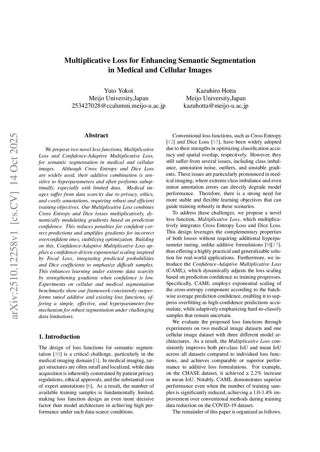 We propose two novel loss functions, Multiplicative Loss and Confidence-Adaptive Multiplicative Loss, for semantic segmentation in medical and cellular images. Although Cross Entropy and Dice Loss are widely used, their additive combination is sensitive to hyperparameters and often performs suboptimally, especially with limited data. Medical images suffer from data scarcity due to privacy, ethics, and costly annotations, requiring robust and efficient training objectives. Our Multiplicative Loss combines Cross Entropy and Dice losses multiplicatively, dynamically modulating gradients based on prediction confidence. This reduces penalties for confident correct predictions and amplifies gradients for incorrect overconfident ones, stabilizing optimization. Building on this, Confidence-Adaptive Multiplicative Loss applies a confidence-driven exponential scaling inspired by Focal Loss, integrating predicted probabilities and Dice coefficients to emphasize difficult samples. This enhances learning under extreme data scarcity by strengthening gradients when confidence is low. Experiments on cellular and medical segmentation benchmarks show our framework consistently outperforms tuned additive and existing loss functions, offering a simple, effective, and hyperparameter-free mechanism for robust segmentation under challenging data limitations.