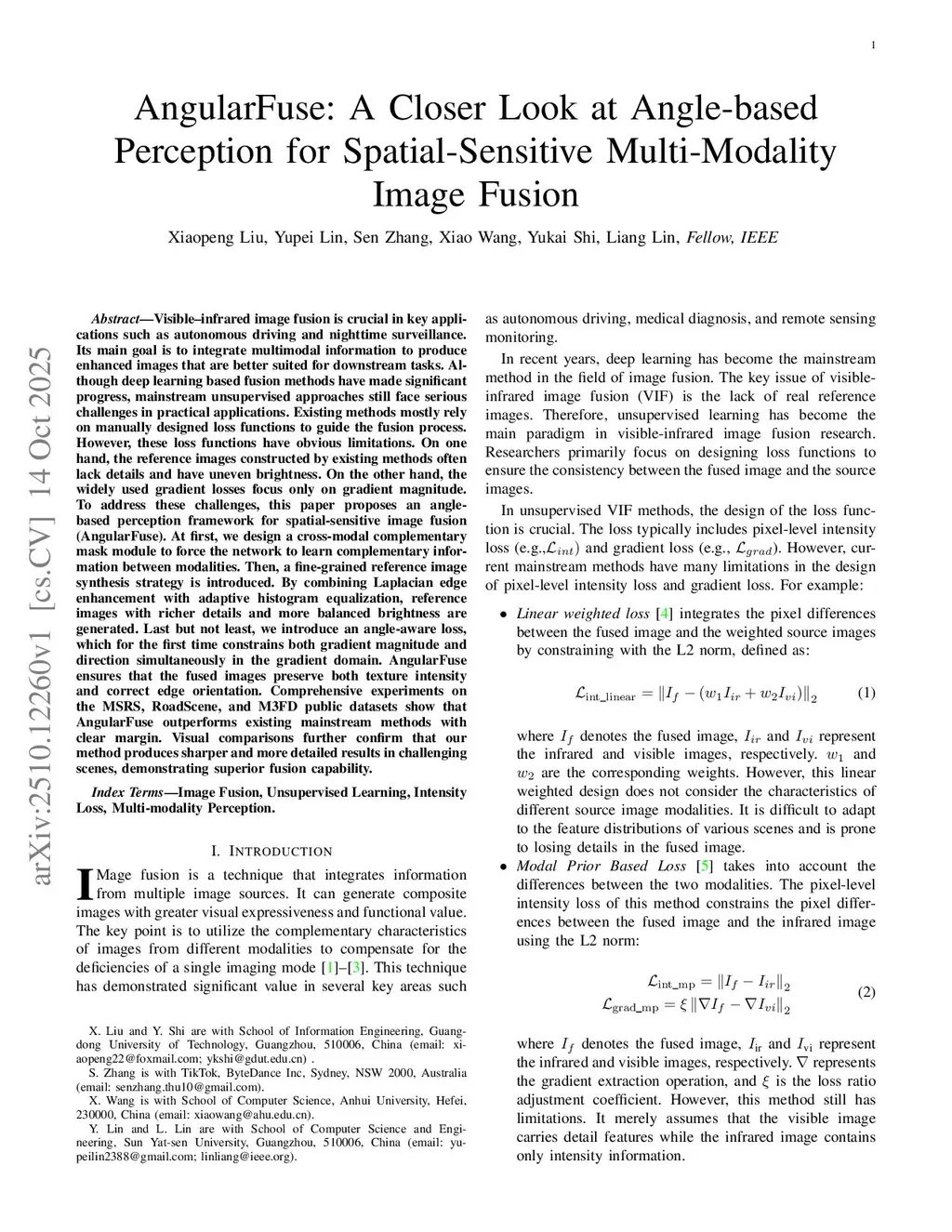 Visible-infrared image fusion is crucial in key applications such as autonomous driving and nighttime surveillance. Its main goal is to integrate multimodal information to produce enhanced images that are better suited for downstream tasks. Although deep learning based fusion methods have made significant progress, mainstream unsupervised approaches still face serious challenges in practical applications. Existing methods mostly rely on manually designed loss functions to guide the fusion process. However, these loss functions have obvious limitations. On one hand, the reference images constructed by existing methods often lack details and have uneven brightness. On the other hand, the widely used gradient losses focus only on gradient magnitude. To address these challenges, this paper proposes an angle-based perception framework for spatial-sensitive image fusion (AngularFuse). At first, we design a cross-modal complementary mask module to force the network to learn complementary information between modalities. Then, a fine-grained reference image synthesis strategy is introduced. By combining Laplacian edge enhancement with adaptive histogram equalization, reference images with richer details and more balanced brightness are generated. Last but not least, we introduce an angle-aware loss, which for the first time constrains both gradient magnitude and direction simultaneously in the gradient domain. AngularFuse ensures that the fused images preserve both texture intensity and correct edge orientation. Comprehensive experiments on the MSRS, RoadScene, and M3FD public datasets show that AngularFuse outperforms existing mainstream methods with clear margin. Visual comparisons further confirm that our method produces sharper and more detailed results in challenging scenes, demonstrating superior fusion capability.