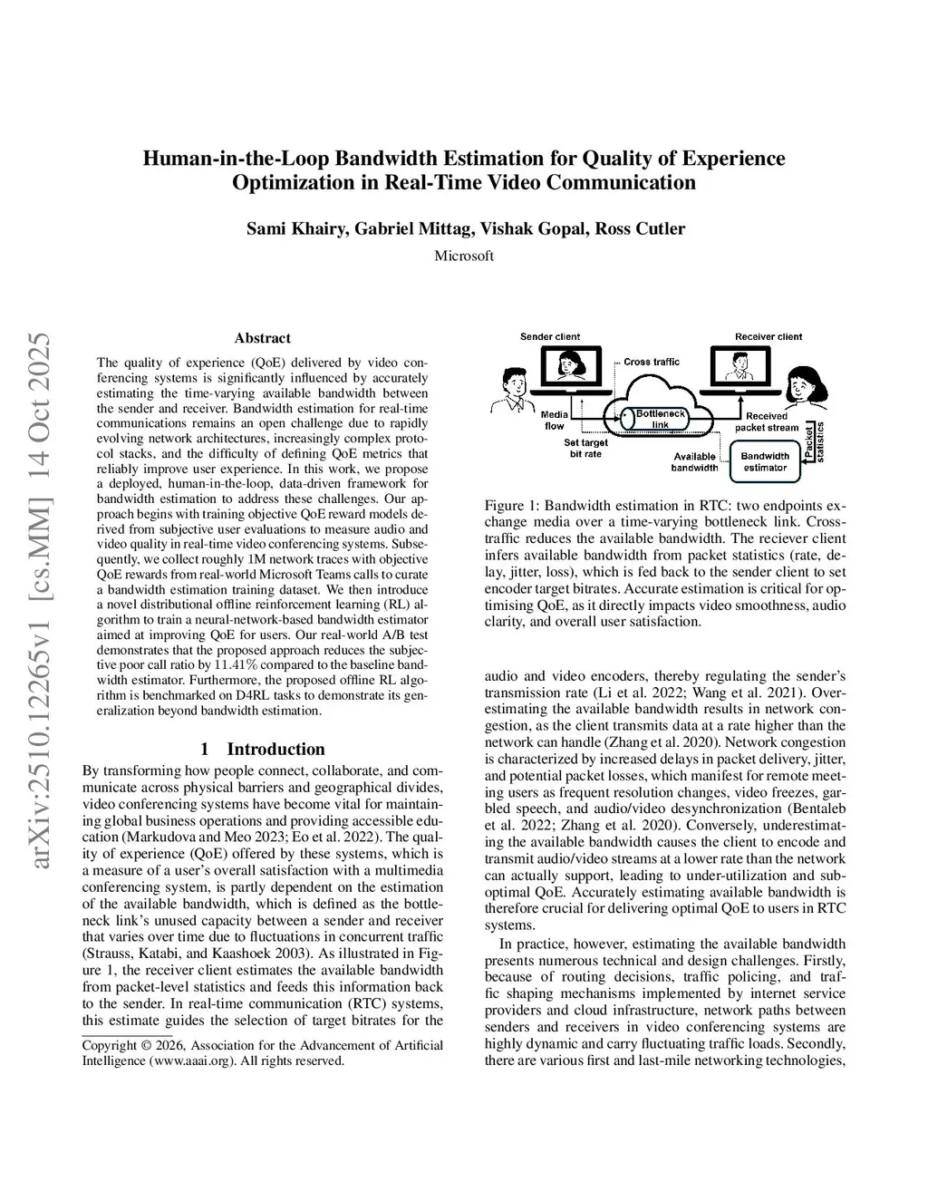 The quality of experience (QoE) delivered by video conferencing systems is significantly influenced by accurately estimating the time-varying available bandwidth between the sender and receiver. Bandwidth estimation for real-time communications remains an open challenge due to rapidly evolving network architectures, increasingly complex protocol stacks, and the difficulty of defining QoE metrics that reliably improve user experience. In this work, we propose a deployed, human-in-the-loop, data-driven framework for bandwidth estimation to address these challenges. Our approach begins with training objective QoE reward models derived from subjective user evaluations to measure audio and video quality in real-time video conferencing systems. Subsequently, we collect roughly M network traces with objective QoE rewards from real-world Microsoft Teams calls to curate a bandwidth estimation training dataset. We then introduce a novel distributional offline reinforcement learning (RL) algorithm to train a neural-network-based bandwidth estimator aimed at improving QoE for users. Our real-world A/B test demonstrates that the proposed approach reduces the subjective poor call ratio by compared to the baseline bandwidth estimator. Furthermore, the proposed offline RL algorithm is benchmarked on D4RL tasks to demonstrate its generalization beyond bandwidth estimation.