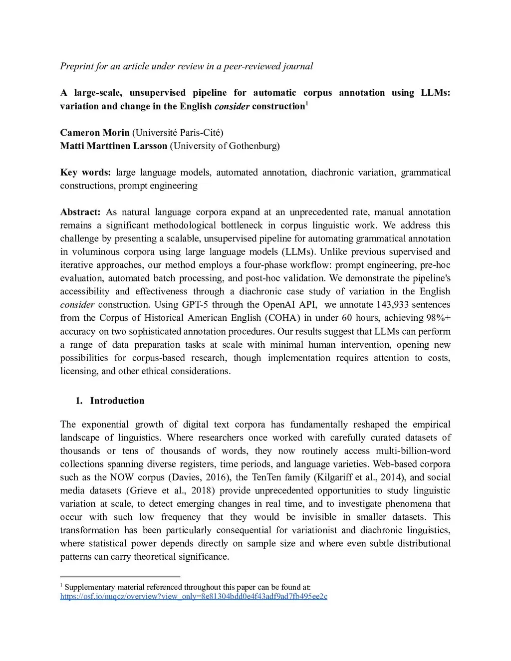 As natural language corpora expand at an unprecedented rate, manual annotation remains a significant methodological bottleneck in corpus linguistic work. We address this challenge by presenting a scalable pipeline for automating grammatical annotation in voluminous corpora using large language models (LLMs). Unlike previous supervised and iterative approaches, our method employs a four-phase workflow: prompt engineering, pre-hoc evaluation, automated batch processing, and post-hoc validation. We demonstrate the pipeline's accessibility and effectiveness through a diachronic case study of variation in the English evaluative consider construction (consider X as/to be/zero Y). We annotate 143,933 'consider' concordance lines from the Corpus of Historical American English (COHA) via the OpenAI API in under 60 hours, achieving 98 percent+ accuracy on two sophisticated annotation procedures. A Bayesian multinomial GAM fitted to 44,527 true positives of the evaluative construction reveals previously undocumented genre-specific trajectories of change, enabling us to advance new hypotheses about the relationship between register formality and competing pressures of morphosyntactic reduction and enhancement. Our results suggest that LLMs can perform a range of data preparation tasks at scale with minimal human intervention, unlocking substantive research questions previously beyond practical reach, though implementation requires attention to costs, licensing, and other ethical considerations.