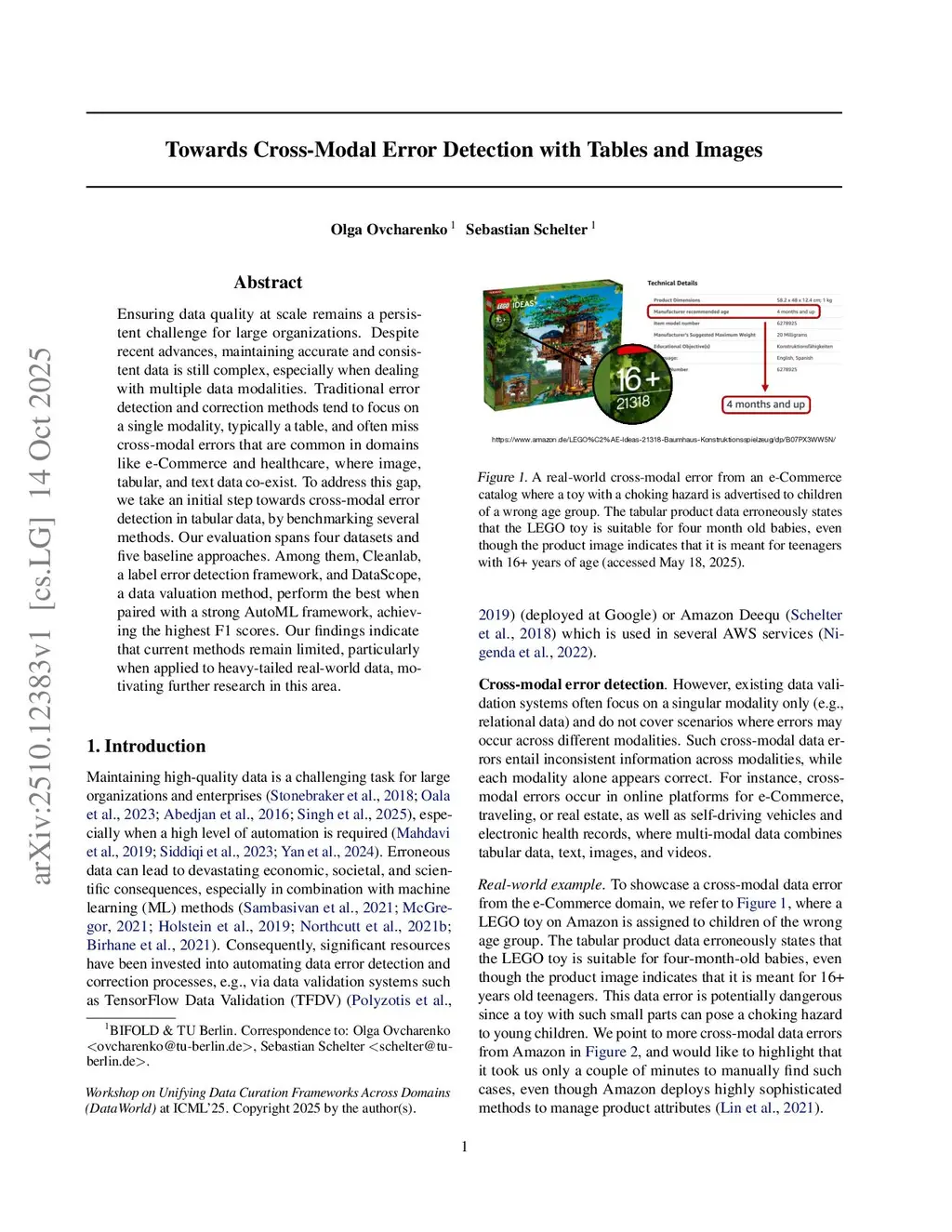 Ensuring data quality at scale remains a persistent challenge for large organizations. Despite recent advances, maintaining accurate and consistent data is still complex, especially when dealing with multiple data modalities. Traditional error detection and correction methods tend to focus on a single modality, typically a table, and often miss cross-modal errors that are common in domains like e-Commerce and healthcare, where image, tabular, and text data co-exist. To address this gap, we take an initial step towards cross-modal error detection in tabular data, by benchmarking several methods. Our evaluation spans four datasets and five baseline approaches. Among them, Cleanlab, a label error detection framework, and DataScope, a data valuation method, perform the best when paired with a strong AutoML framework, achieving the highest F1 scores. Our findings indicate that current methods remain limited, particularly when applied to heavy-tailed real-world data, motivating further research in this area.