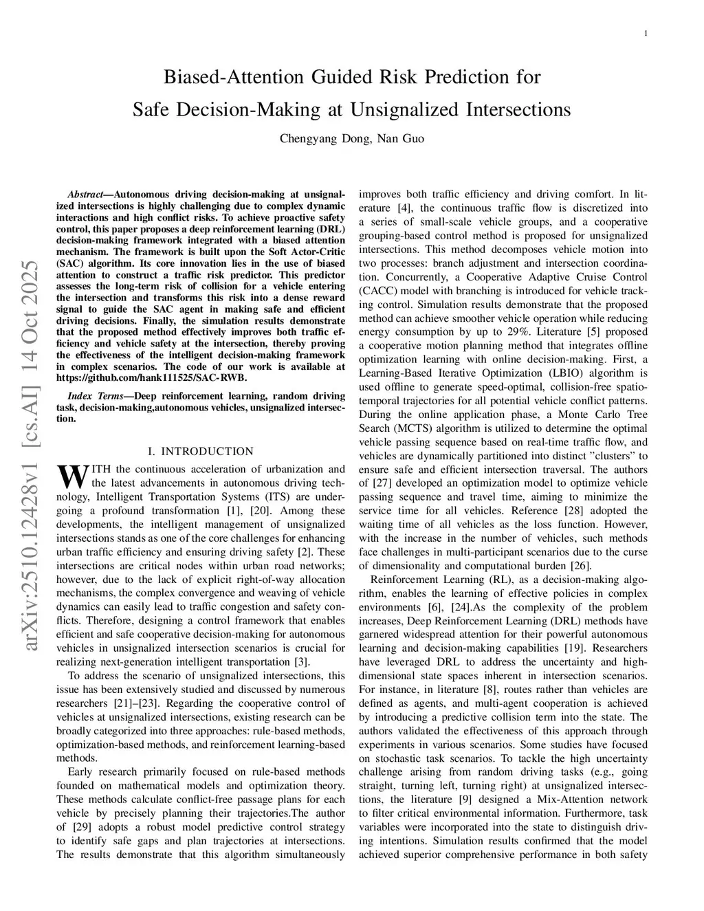 Autonomous driving decision-making at unsignalized intersections is highly challenging due to complex dynamic interactions and high conflict risks. To achieve proactive safety control, this paper proposes a deep reinforcement learning (DRL) decision-making framework integrated with a biased attention mechanism. The framework is built upon the Soft Actor-Critic (SAC) algorithm. Its core innovation lies in the use of biased attention to construct a traffic risk predictor. This predictor assesses the long-term risk of collision for a vehicle entering the intersection and transforms this risk into a dense reward signal to guide the SAC agent in making safe and efficient driving decisions. Finally, the simulation results demonstrate that the proposed method effectively improves both traffic efficiency and vehicle safety at the intersection, thereby proving the effectiveness of the intelligent decision-making framework in complex scenarios. The code of our work is available atthis https URL.