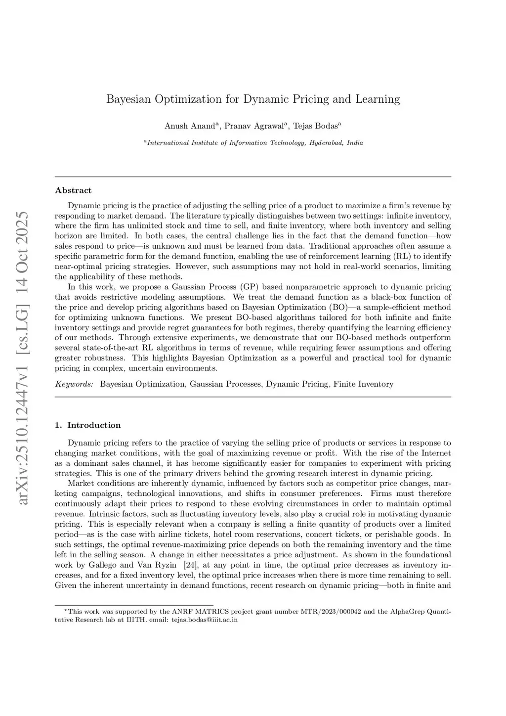Dynamic pricing is the practice of adjusting the selling price of a product to maximize a firm's revenue by responding to market demand. The literature typically distinguishes between two settings: infinite inventory, where the firm has unlimited stock and time to sell, and finite inventory, where both inventory and selling horizon are limited. In both cases, the central challenge lies in the fact that the demand function -- how sales respond to price -- is unknown and must be learned from data. Traditional approaches often assume a specific parametric form for the demand function, enabling the use of reinforcement learning (RL) to identify near-optimal pricing strategies. However, such assumptions may not hold in real-world scenarios, limiting the applicability of these methods. In this work, we propose a Gaussian Process (GP) based nonparametric approach to dynamic pricing that avoids restrictive modeling assumptions. We treat the demand function as a black-box function of the price and develop pricing algorithms based on Bayesian Optimization (BO) -- a sample-efficient method for optimizing unknown functions. We present BO-based algorithms tailored for both infinite and finite inventory settings and provide regret guarantees for both regimes, thereby quantifying the learning efficiency of our methods. Through extensive experiments, we demonstrate that our BO-based methods outperform several state-of-the-art RL algorithms in terms of revenue, while requiring fewer assumptions and offering greater robustness. This highlights Bayesian Optimization as a powerful and practical tool for dynamic pricing in complex, uncertain environments.