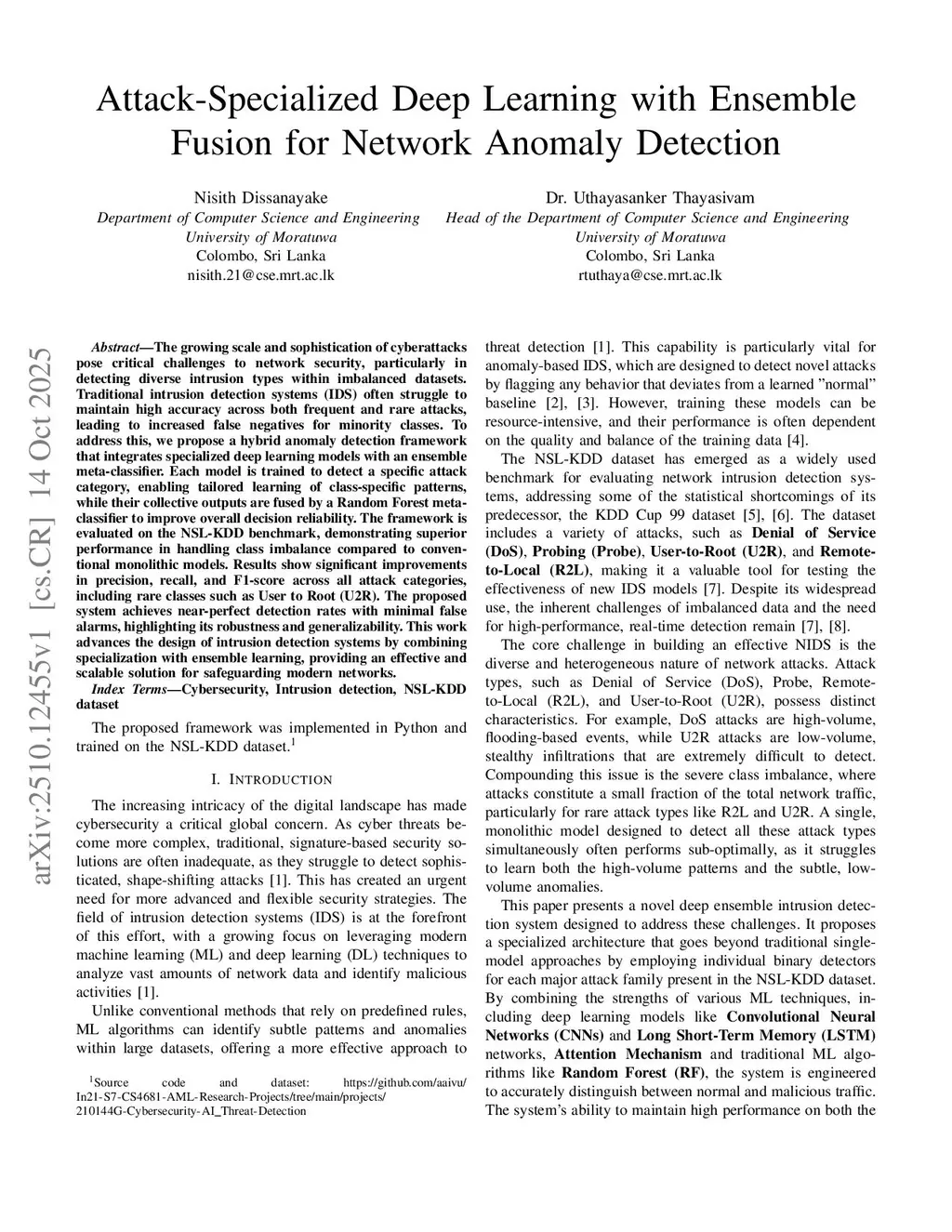The growing scale and sophistication of cyberattacks pose critical challenges to network security, particularly in detecting diverse intrusion types within imbalanced datasets. Traditional intrusion detection systems (IDS) often struggle to maintain high accuracy across both frequent and rare attacks, leading to increased false negatives for minority classes. To address this, we propose a hybrid anomaly detection framework that integrates specialized deep learning models with an ensemble meta-classifier. Each model is trained to detect a specific attack category, enabling tailored learning of class-specific patterns, while their collective outputs are fused by a Random Forest meta-classifier to improve overall decision reliability. The framework is evaluated on the NSL-KDD benchmark, demonstrating superior performance in handling class imbalance compared to conventional monolithic models. Results show significant improvements in precision, recall, and F1-score across all attack categories, including rare classes such as User to Root (U2R). The proposed system achieves near-perfect detection rates with minimal false alarms, highlighting its robustness and generalizability. This work advances the design of intrusion detection systems by combining specialization with ensemble learning, providing an effective and scalable solution for safeguarding modern networks.