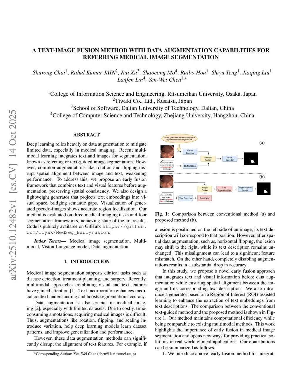 Deep learning relies heavily on data augmentation to mitigate limited data, especially in medical imaging. Recent multimodal learning integrates text and images for segmentation, known as referring or text-guided image segmentation. However, common augmentations like rotation and flipping disrupt spatial alignment between image and text, weakening performance. To address this, we propose an early fusion framework that combines text and visual features before augmentation, preserving spatial consistency. We also design a lightweight generator that projects text embeddings into visual space, bridging semantic gaps. Visualization of generated pseudo-images shows accurate region localization. Our method is evaluated on three medical imaging tasks and four segmentation frameworks, achieving state-of-the-art results. Code is publicly available on GitHub:this https URL.