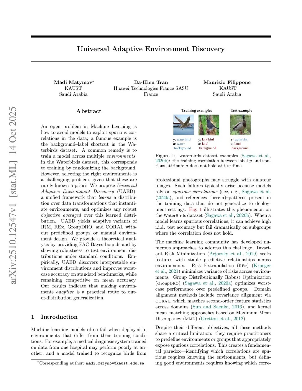 An open problem in Machine Learning is how to avoid models to exploit spurious correlations in the data; a famous example is the background-label shortcut in the Waterbirds dataset. A common remedy is to train a model across multiple environments; in the Waterbirds dataset, this corresponds to training by randomizing the background. However, selecting the right environments is a challenging problem, given that these are rarely known a priori. We propose Universal Adaptive Environment Discovery (UAED), a unified framework that learns a distribution over data transformations that instantiate environments, and optimizes any robust objective averaged over this learned distribution. UAED yields adaptive variants of IRM, REx, GroupDRO, and CORAL without predefined groups or manual environment design. We provide a theoretical analysis by providing PAC-Bayes bounds and by showing robustness to test environment distributions under standard conditions. Empirically, UAED discovers interpretable environment distributions and improves worst-case accuracy on standard benchmarks, while remaining competitive on mean accuracy. Our results indicate that making environments adaptive is a practical route to out-of-distribution generalization.