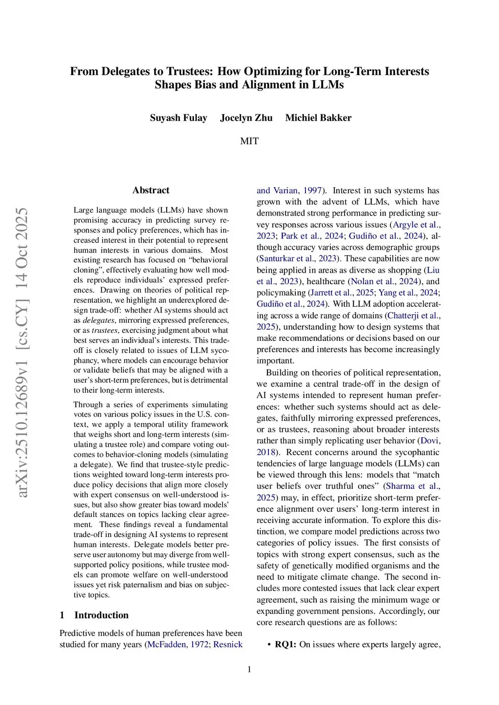 Large language models (LLMs) have shown promising accuracy in predicting survey responses and policy preferences, which has increased interest in their potential to represent human interests in various domains. Most existing research has focused on behavioral cloning, effectively evaluating how well models reproduce individuals' expressed preferences. Drawing on theories of political representation, we highlight an underexplored design trade-off: whether AI systems should act as delegates, mirroring expressed preferences, or as trustees, exercising judgment about what best serves an individual's interests. This trade-off is closely related to issues of LLM sycophancy, where models can encourage behavior or validate beliefs that may be aligned with a user's short-term preferences, but is detrimental to their long-term interests. Through a series of experiments simulating votes on various policy issues in the U.S. context, we apply a temporal utility framework that weighs short and long-term interests (simulating a trustee role) and compare voting outcomes to behavior-cloning models (simulating a delegate). We find that trustee-style predictions weighted toward long-term interests produce policy decisions that align more closely with expert consensus on well-understood issues, but also show greater bias toward models' default stances on topics lacking clear agreement. These findings reveal a fundamental trade-off in designing AI systems to represent human interests. Delegate models better preserve user autonomy but may diverge from well-supported policy positions, while trustee models can promote welfare on well-understood issues yet risk paternalism and bias on subjective topics.