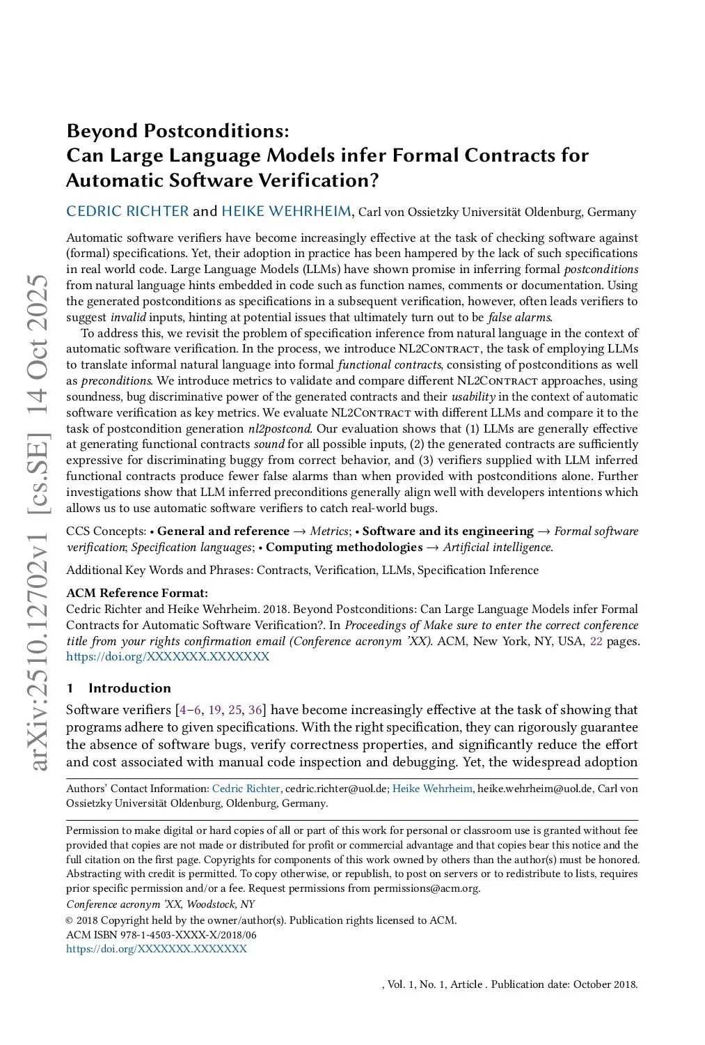 Beyond Postconditions: Can Large Language Models infer Formal Contracts for Automatic Software Verification?