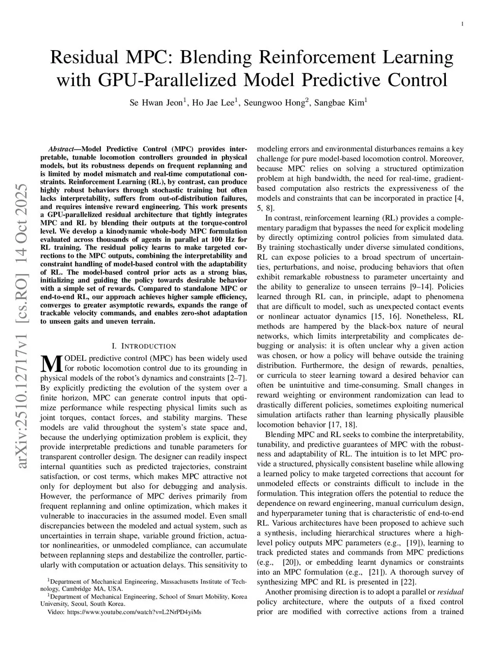 Model Predictive Control (MPC) provides interpretable, tunable locomotion controllers grounded in physical models, but its robustness depends on frequent replanning and is limited by model mismatch and real-time computational constraints. Reinforcement Learning (RL), by contrast, can produce highly robust behaviors through stochastic training but often lacks interpretability, suffers from out-of-distribution failures, and requires intensive reward engineering. This work presents a GPU-parallelized residual architecture that tightly integrates MPC and RL by blending their outputs at the torque-control level. We develop a kinodynamic whole-body MPC formulation evaluated across thousands of agents in parallel at 100 Hz for RL training. The residual policy learns to make targeted corrections to the MPC outputs, combining the interpretability and constraint handling of model-based control with the adaptability of RL. The model-based control prior acts as a strong bias, initializing and guiding the policy towards desirable behavior with a simple set of rewards. Compared to standalone MPC or end-to-end RL, our approach achieves higher sample efficiency, converges to greater asymptotic rewards, expands the range of trackable velocity commands, and enables zero-shot adaptation to unseen gaits and uneven terrain.