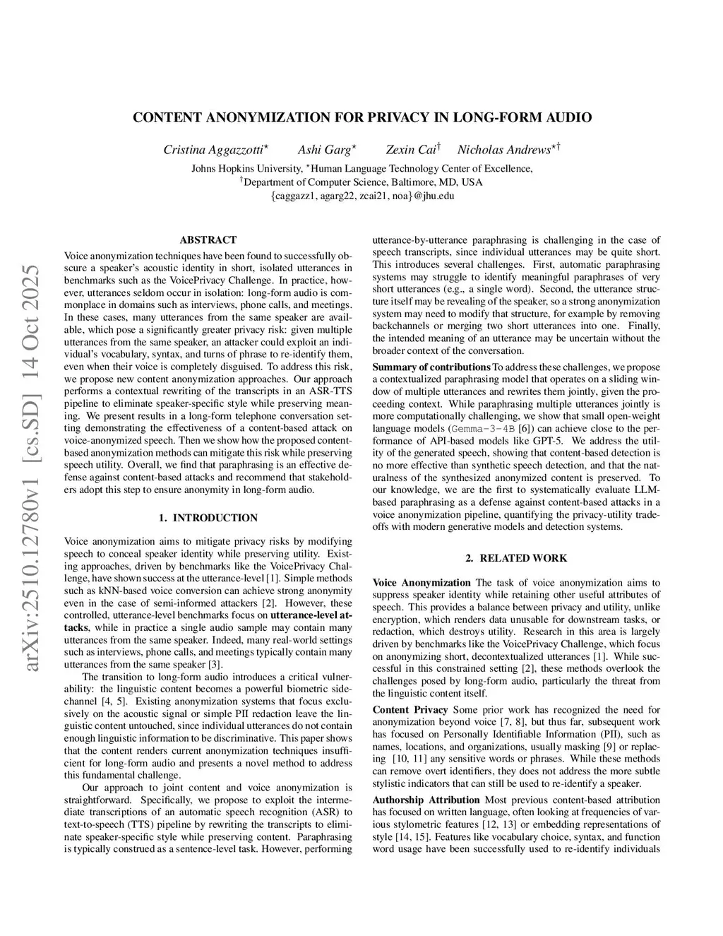 Voice anonymization techniques have been found to successfully obscure a speaker's acoustic identity in short, isolated utterances in benchmarks such as the VoicePrivacy Challenge. In practice, however, utterances seldom occur in isolation: long-form audio is commonplace in domains such as interviews, phone calls, and meetings. In these cases, many utterances from the same speaker are available, which pose a significantly greater privacy risk: given multiple utterances from the same speaker, an attacker could exploit an individual's vocabulary, syntax, and turns of phrase to re-identify them, even when their voice is completely disguised. To address this risk, we propose a new approach that performs a contextual rewriting of the transcripts in an ASR-TTS pipeline to eliminate speaker-specific style while preserving meaning. We present results in a long-form telephone conversation setting demonstrating the effectiveness of a content-based attack on voice-anonymized speech. Then we show how the proposed content-based anonymization methods can mitigate this risk while preserving speech utility. Overall, we find that paraphrasing is an effective defense against content-based attacks and recommend that stakeholders adopt this step to ensure anonymity in long-form audio.